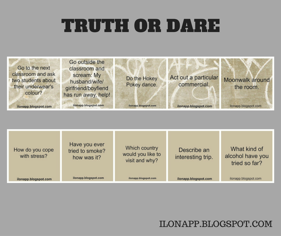 2) Uczeń kręci butelką i pyta osobę, na którą wypadło. Pyta kolegę/koleżankę: „Truth or dare?”. Pytany losuje pytanie/wyzwanie i odpowiada.