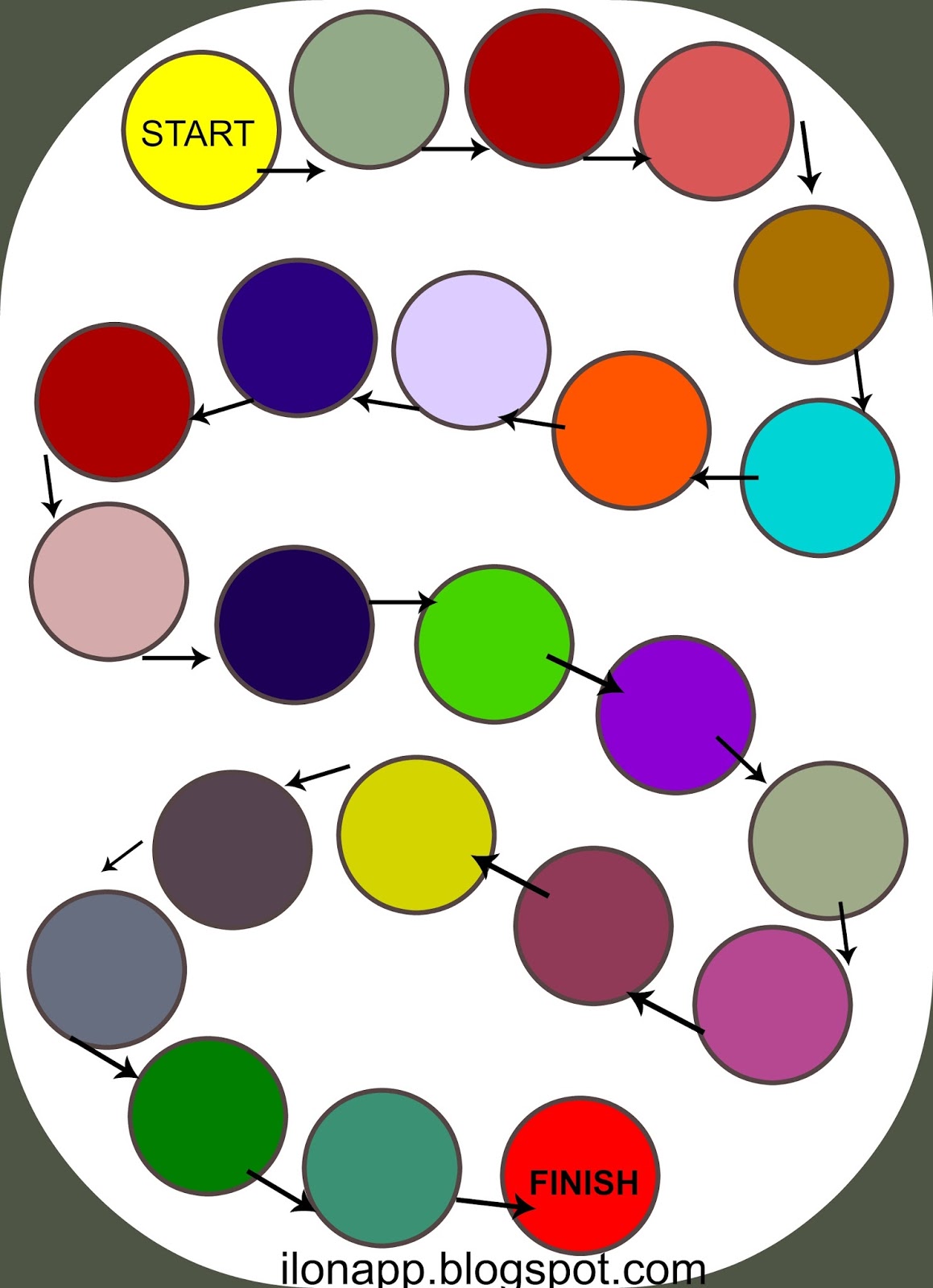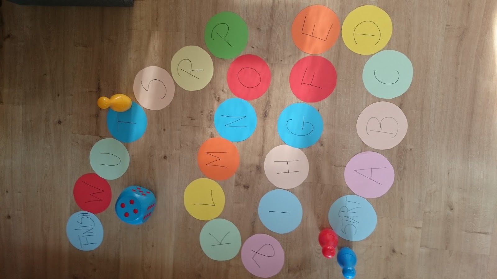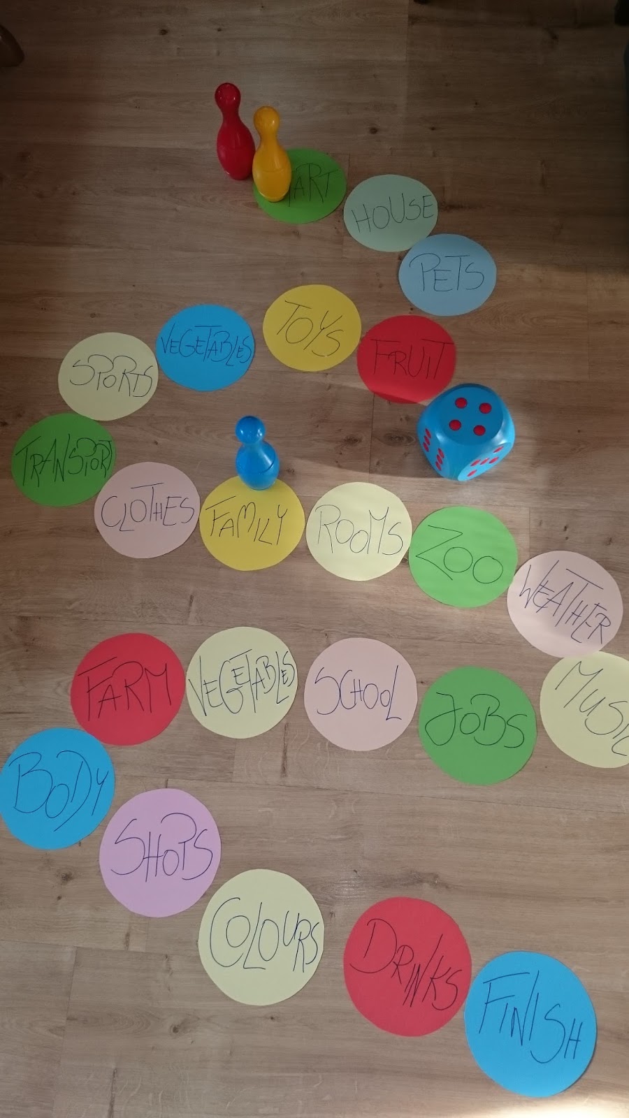 Gry te możemy również przenieść na podłogę poprzez wycięcie kółek na bazie podstawki czy małego talerzyka lub wykorzystanie poniższych wzorów wydrukowanych na kolorowych kartkach, Następnie napisanie literek lub kategorii. Polecam zastosowanie ogromnych kostek oraz mini kręgli. Jeśli mamy wystarczająco duże pomieszczenie „ruchomymi pionkami” mogą stać się dzieci, co przyniesie im na pewno wiele radości.