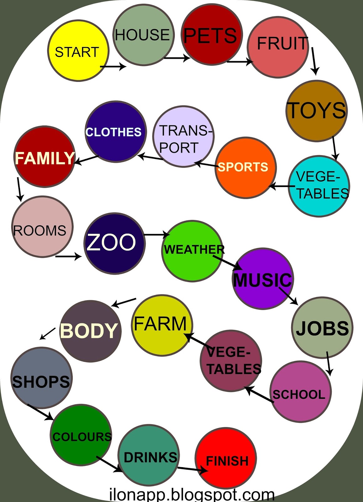 Kolejna wersja jest tematyczna. W każdym polu znajduje się dziedzina. Na początku gry ustalamy ilość słówek, które należy powiedzieć, aby zostać na danym polu. Możemy również wykorzystać tę planszę do mówienia / speakingu na dany temat, ustalając ile zdań ma zostać ułożonych.