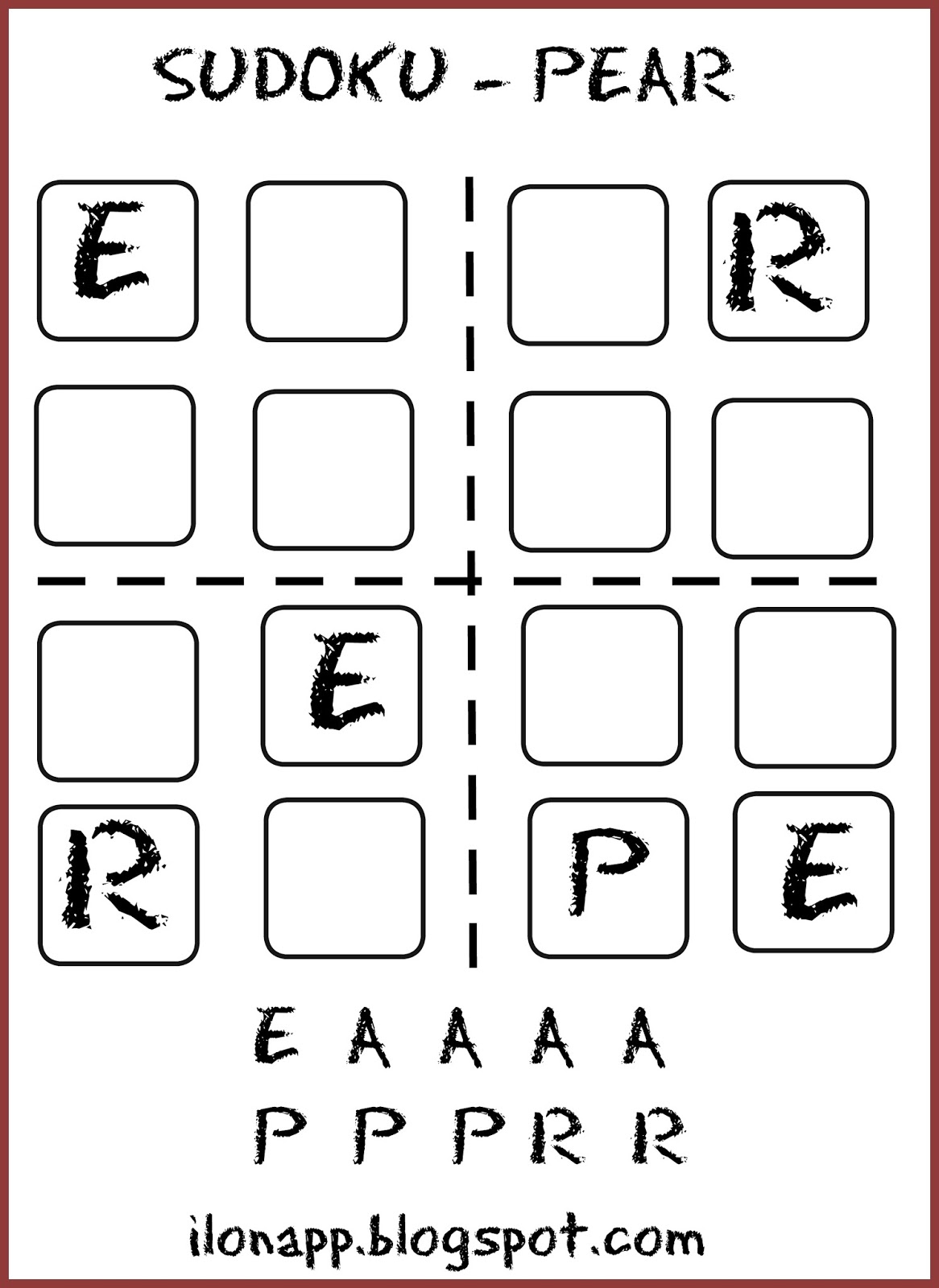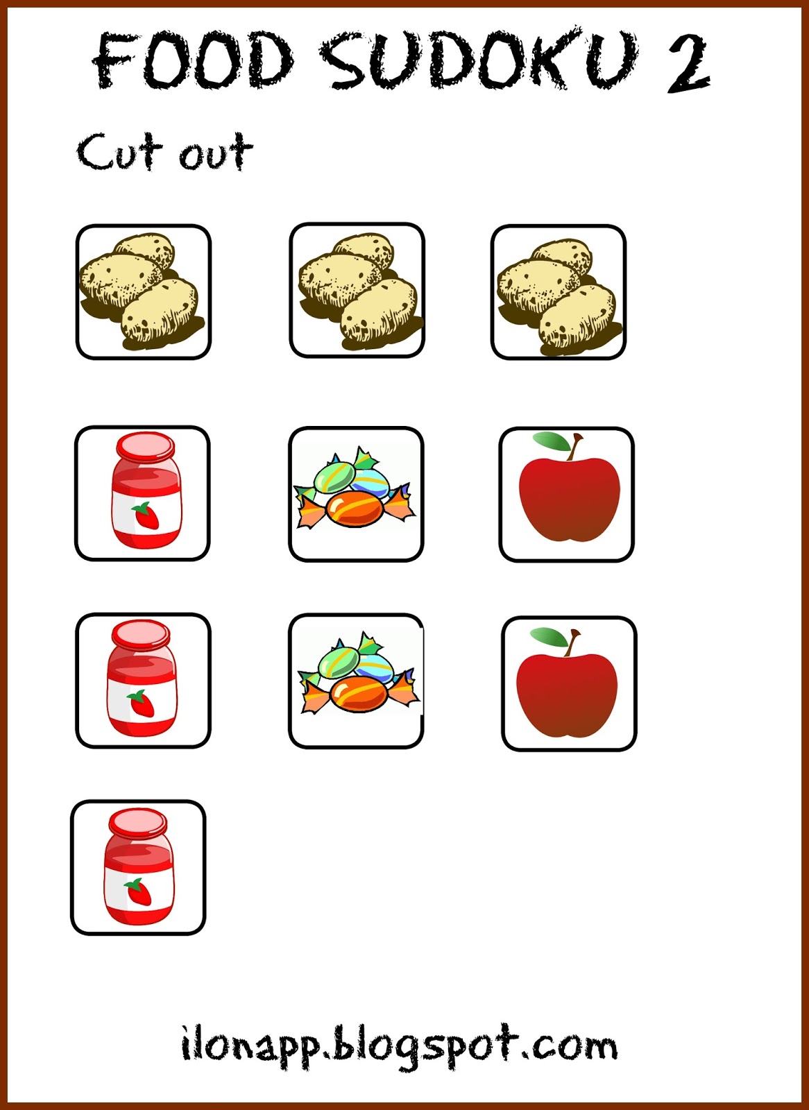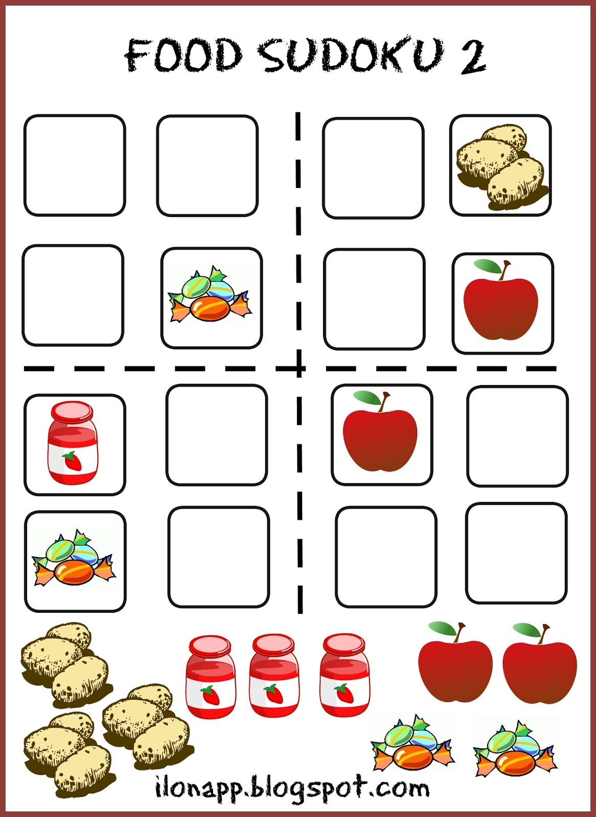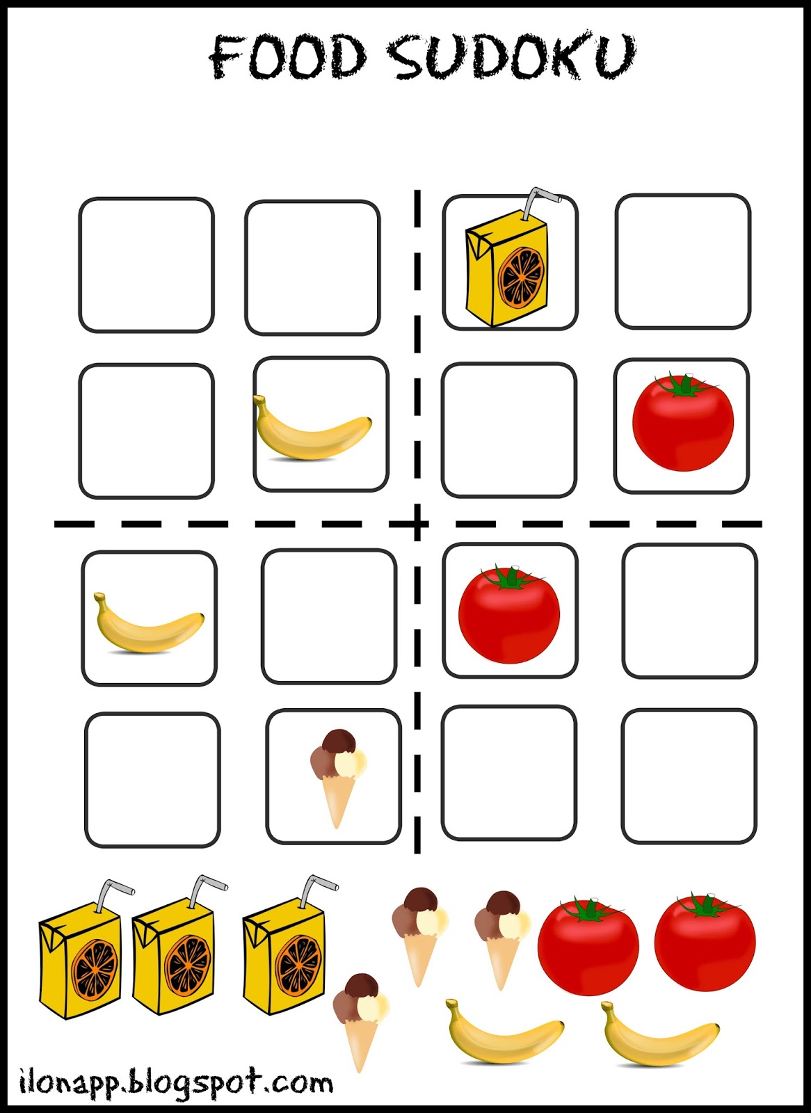 Przeglądając cyfrowe karty sudoku w Internecie spotkałam się z paroma wersjami dla początkujących w formie obrazkowej oraz słownej. Zaświeciła się lampka – przecież to może być bardzo fajna pomoc dydaktyczna. Na razie stworzyłam wersje związane z tematem jedzenia, przy czym sudoku w wersji obrazkowej nadaje się do każdego tematu.