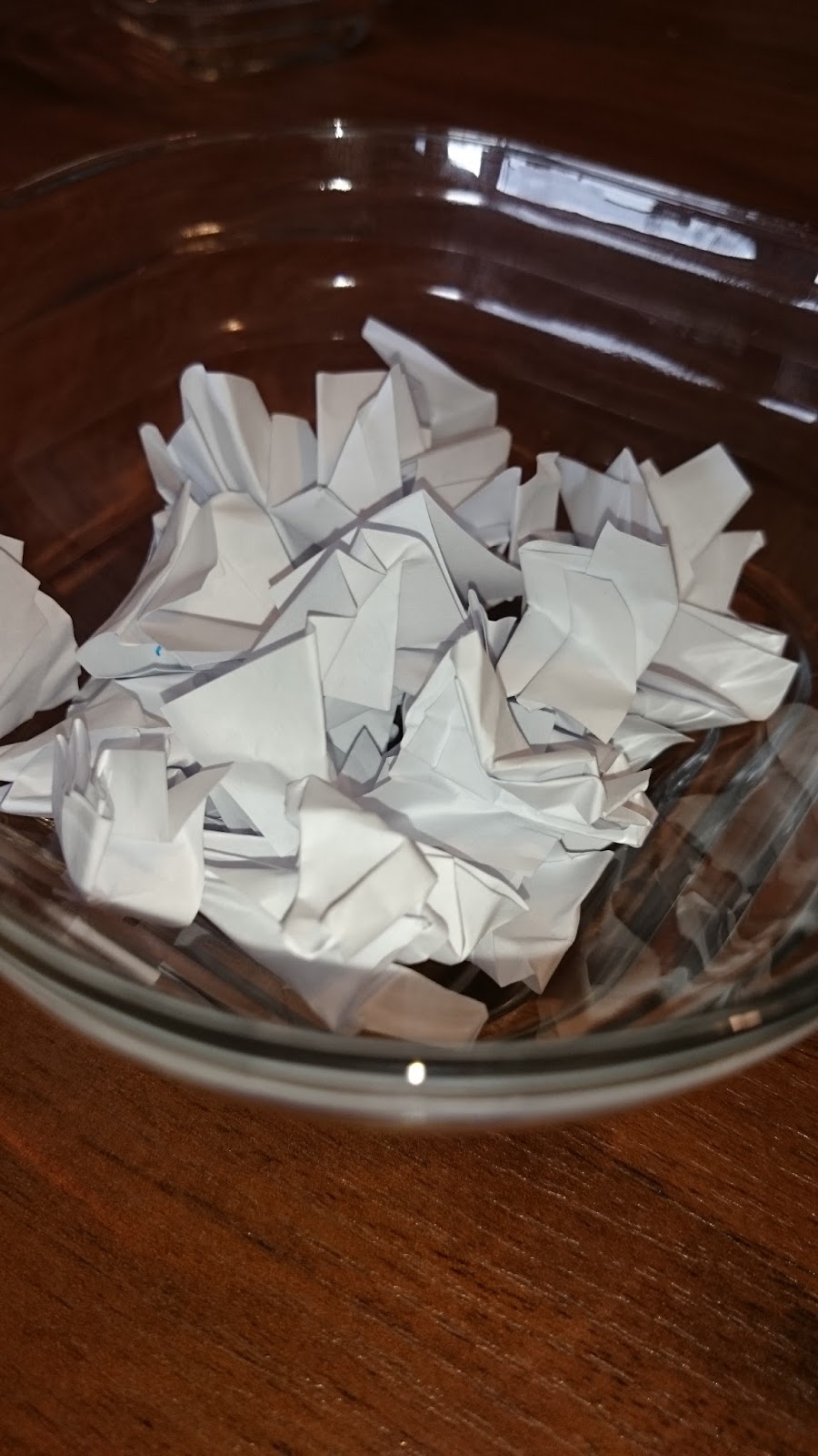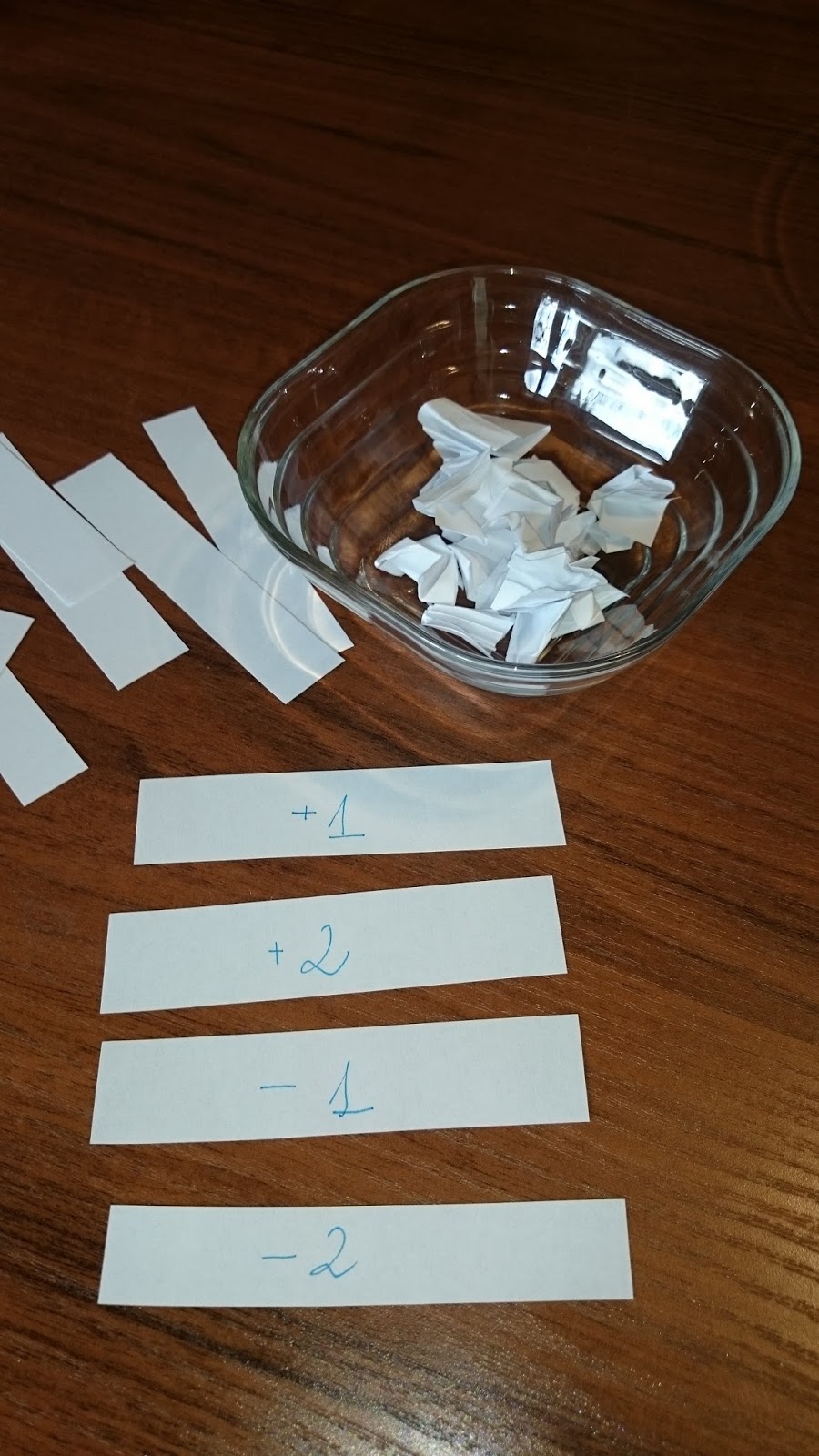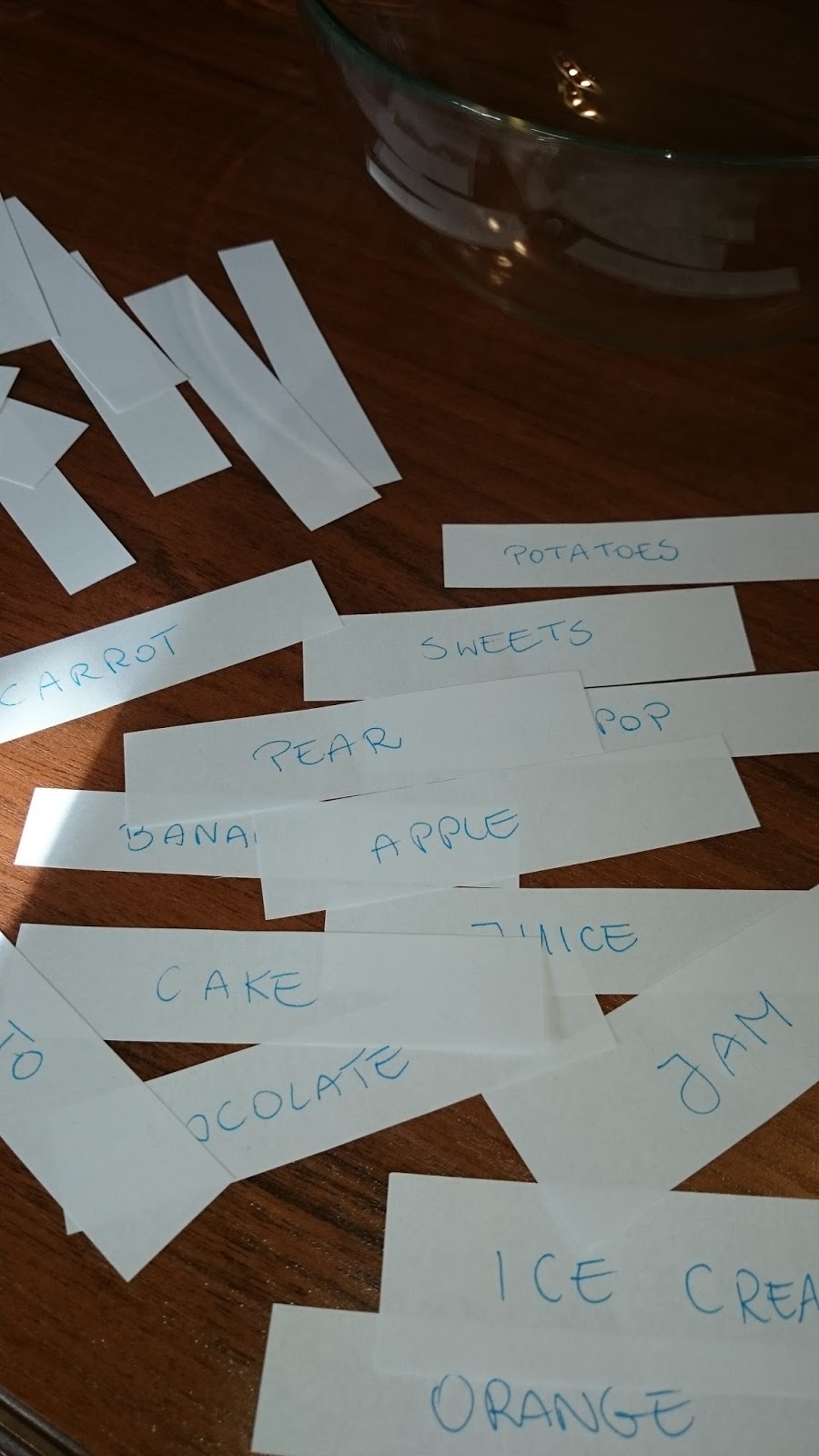 Ja skupię się na jedzonku 🙂 Kartkę papieru rozcinamy na mniejsze kawałki. Na nich piszemy aktualnie omawiane nazwy owoców, warzyw czy potraw. Zgniatamy i wrzucamy do dużej miski.