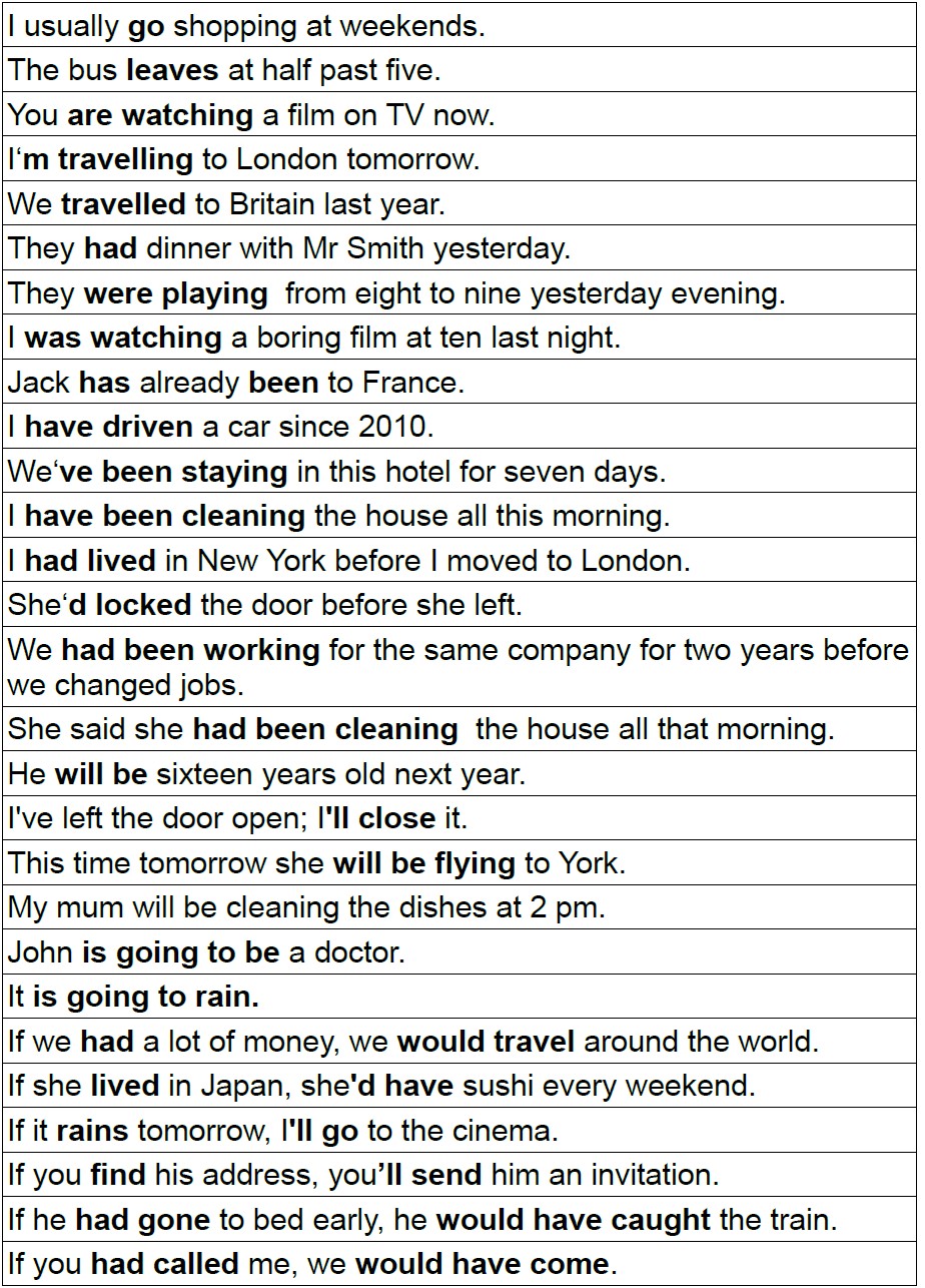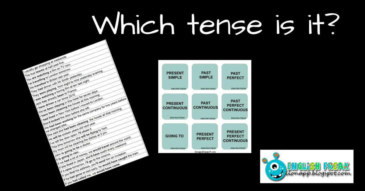 Niektórzy uczniowie potrzebują identyfikacji czasu, rozpoznania i nazwania go. Stworzyłam więc karty z nazwami czasów gramatycznych oraz listę przykładowych zdań.