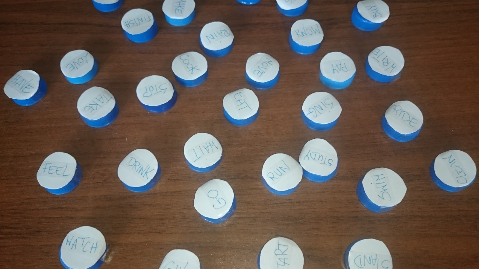 Na nakrętkach umieszczamy czasowniki regularne oraz nieregularne.