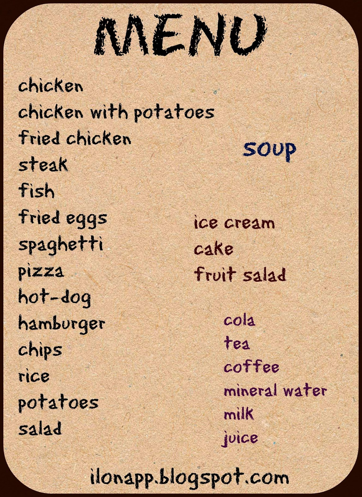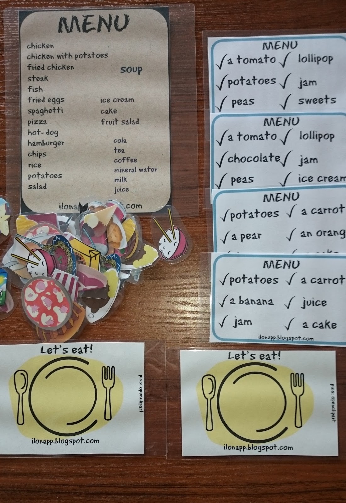 Karty z daniami, menu oraz talerzem drukujemy kilkakrotnie w zależności od ilości uczniów. Rozdajemy menu, klienci zamawiają poszczególne dania używając odpowiednich zwrotów: