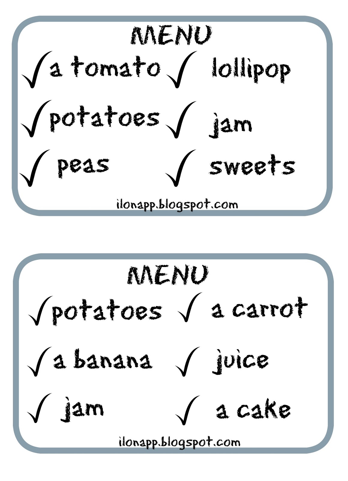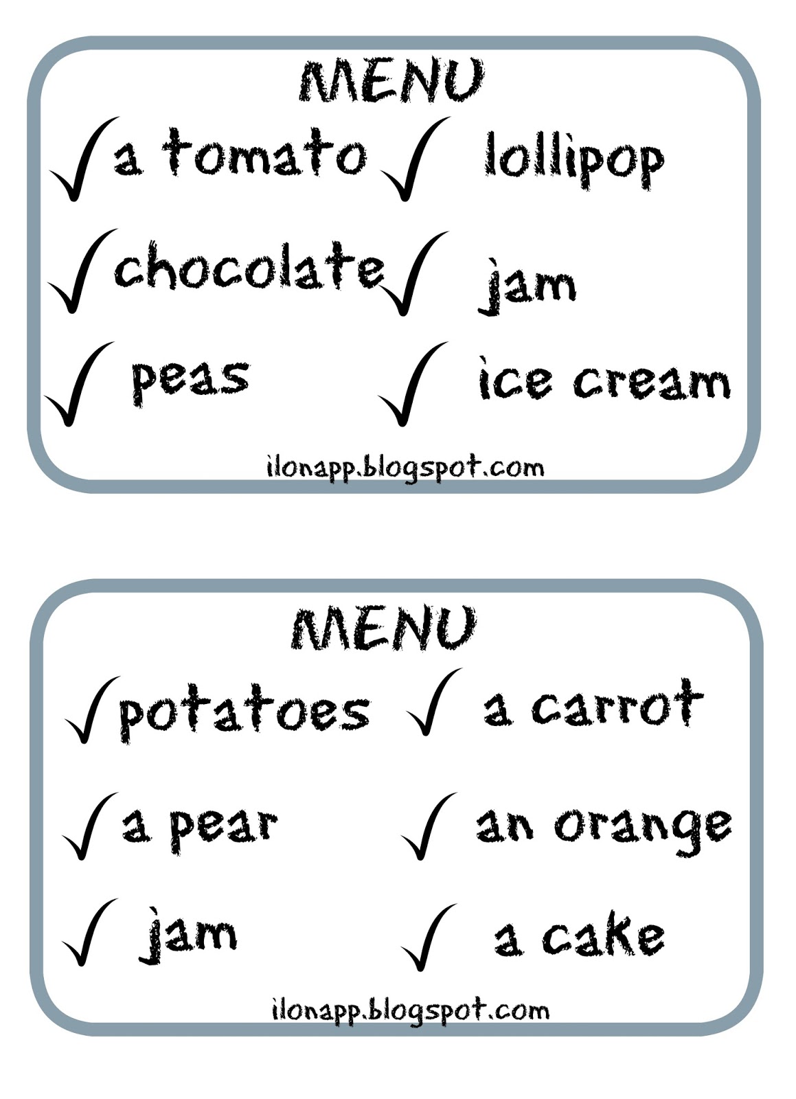 Tym razem mam dla Was grę „Let’s Eat Game”. Temat „jedzenia” jest bardzo obszerny, więc materiałów jest zawsze mało 😉 Zawartość menu jest przykładowa. Wiadomo, iż słownictwo może znacznie się różnić w zależności od etapu edukacyjnego i wybranego podręcznika. Zasady wersji drugiej są podobne do „My shopping list”.