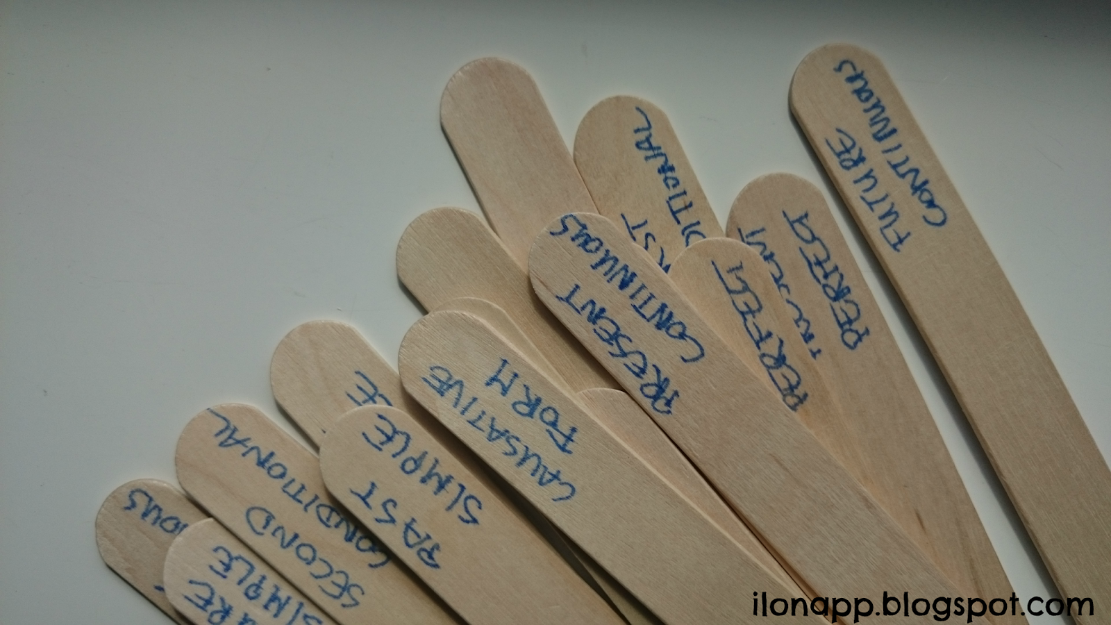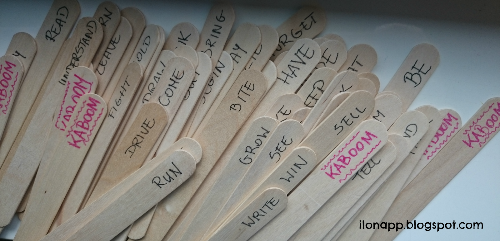 4. losujemy patyczki, tak aby nie widzieć co jest napisane, czasownik odmieniamy wedle ustalonych zasad, KABOOM – tracimy wszystkie punkty:)