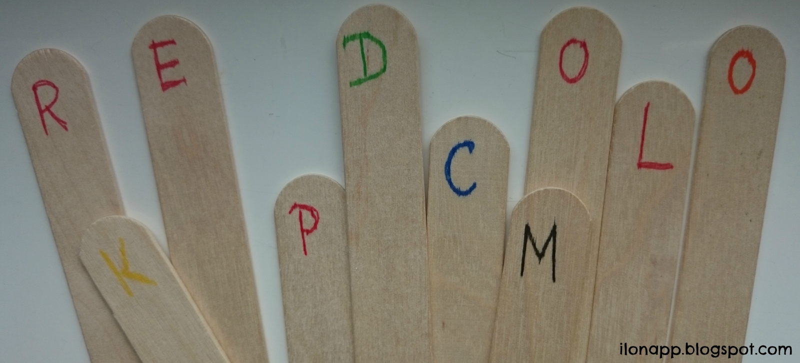 – przyporządkowanie patyczków z napisem oraz kolorowy lub kolorowy przedmiotów