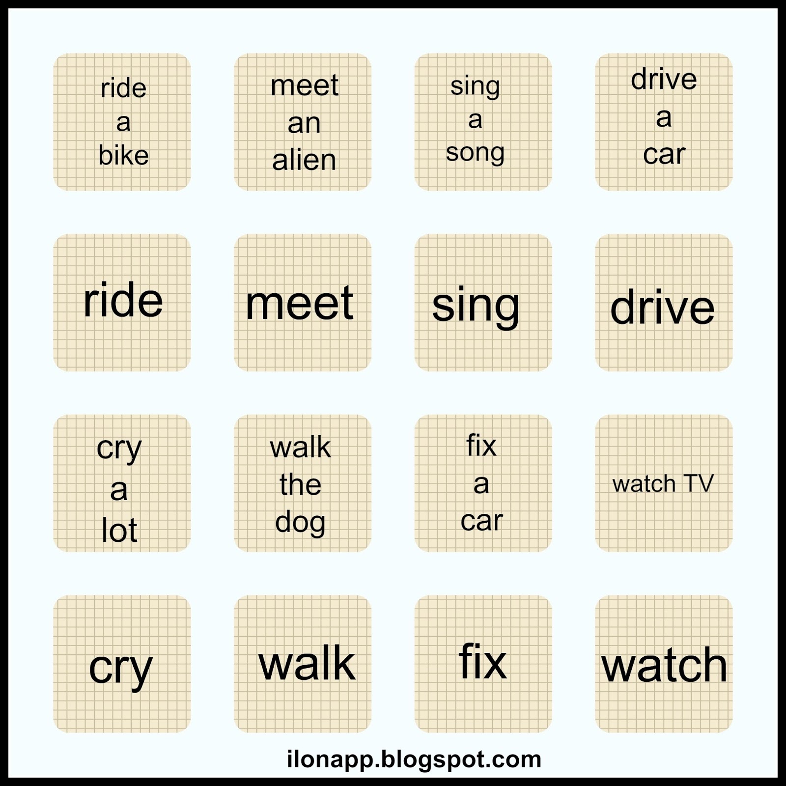 - BUILDING SENTENCES – tworzenie zdań w czasach Present Simple, Present Continuous, Past Simple, Past Continuous oraz Present Perfect z pomocą kart: