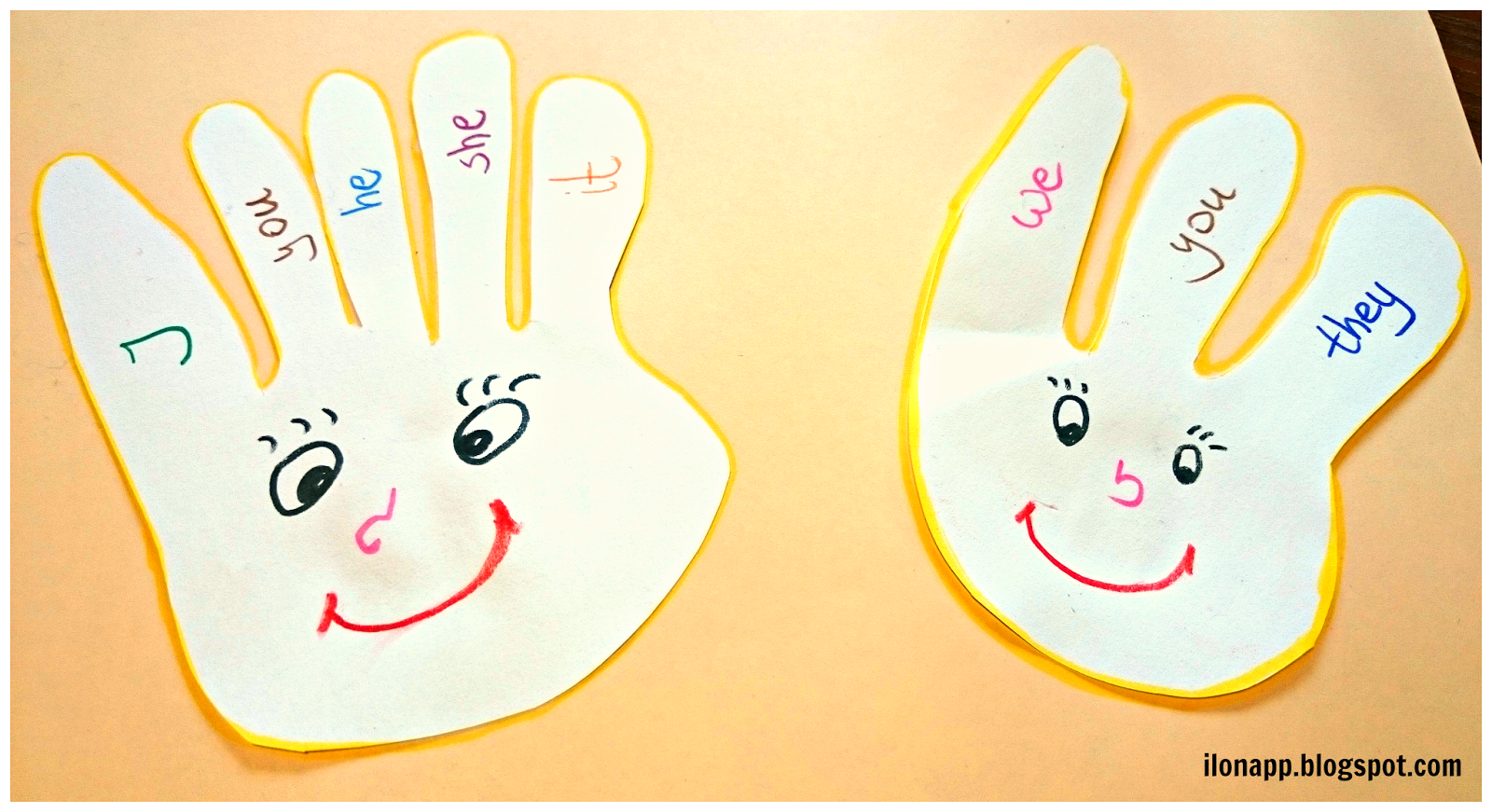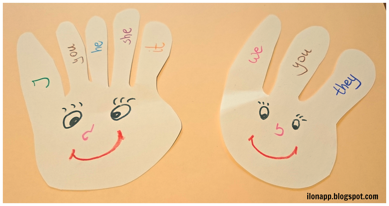 a gdyby tak w ten sposób rysować "to be" na każdy palec np. do palca "I" dac pierścionek "am" itp…