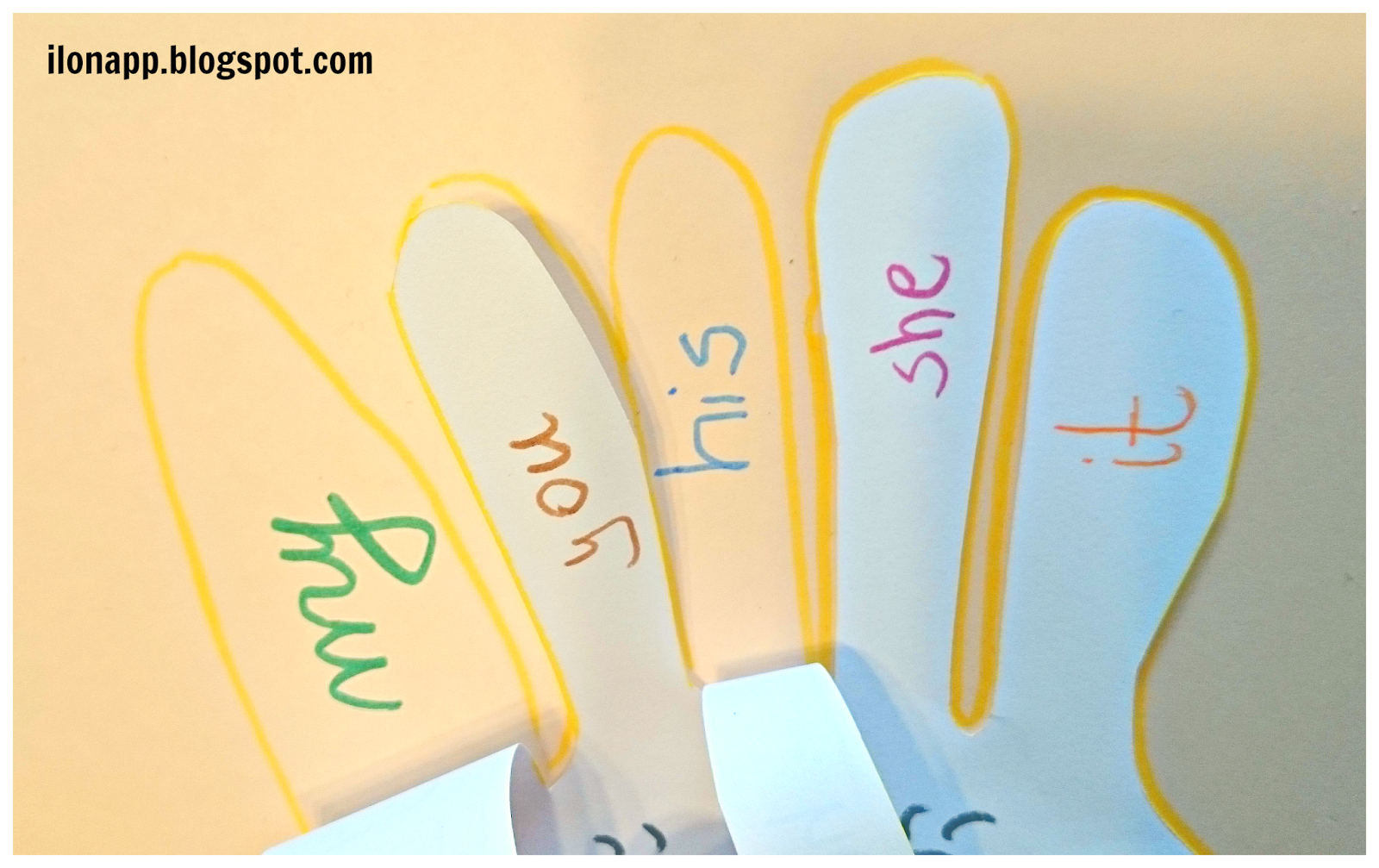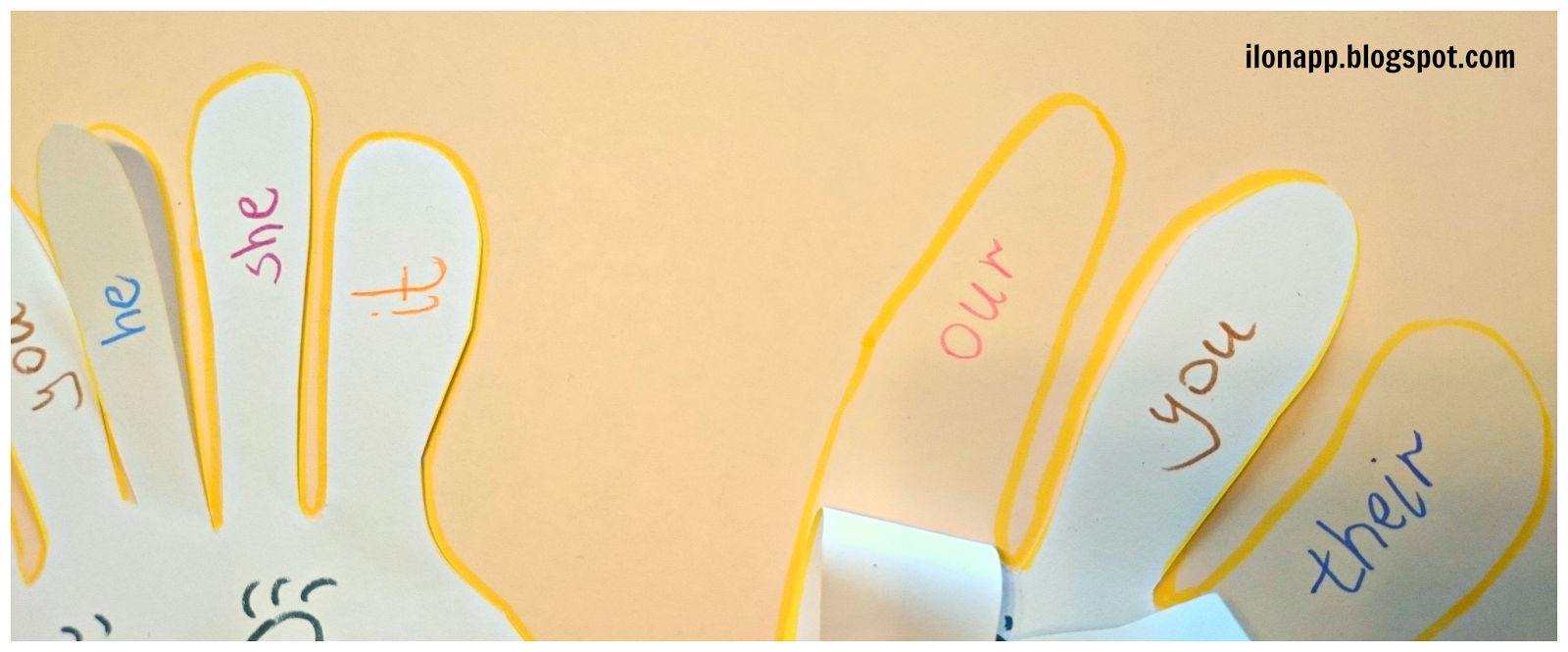 Uczniowie otrzymują gotowe łapki lub zachęcamy ich do odrysowania swoich, dzięki czemu praca będzie spersonalizowana. Na naklejonej części wypisujemy podstawowe zaimki osobowe, a pod paluszkami piszemy odpowiednie formy przymiotników dzierżawczych. Powtórka w domu na pewno stanie się dużo przyjemniejsza 🙂