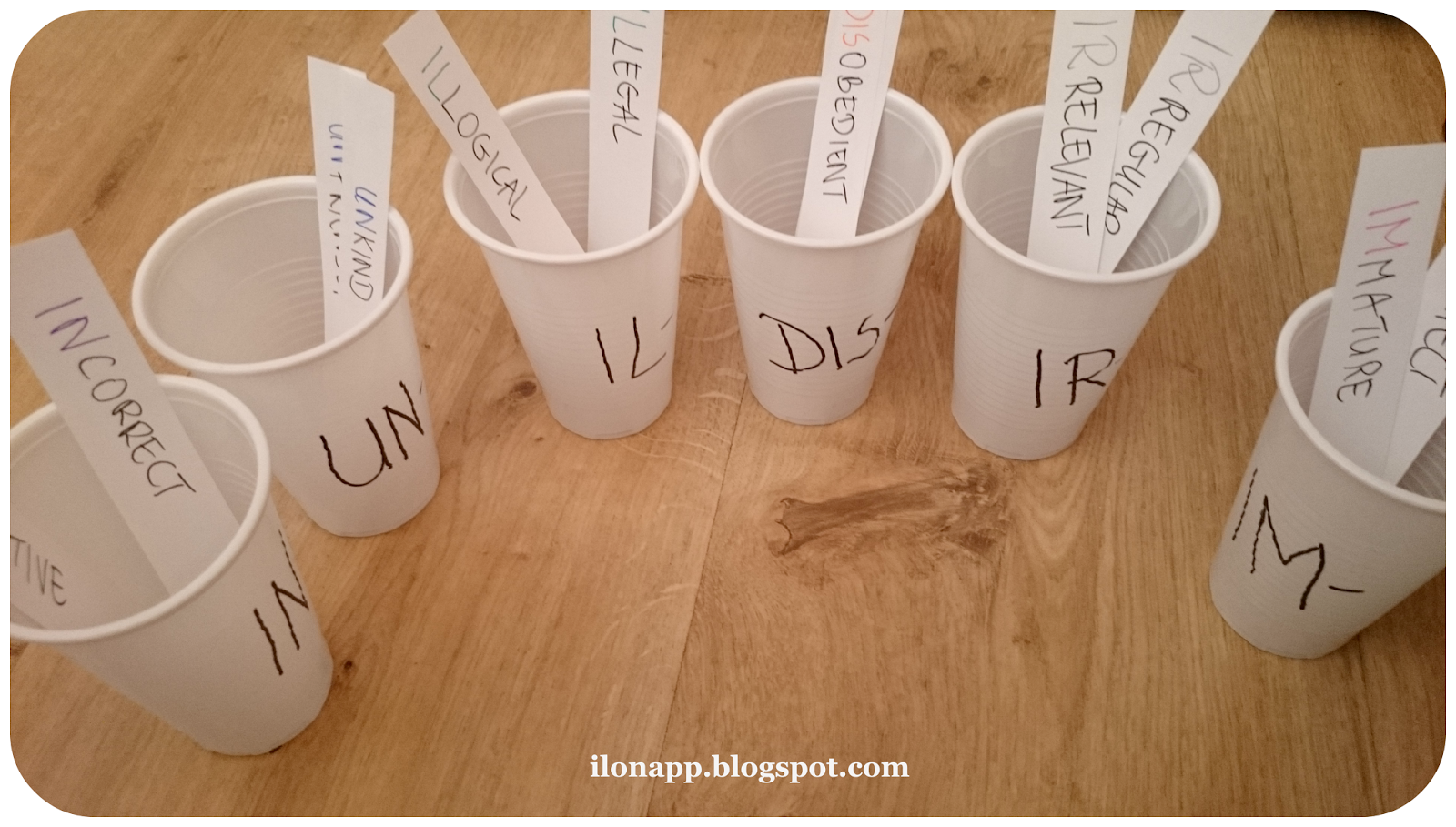 - plastikowe kubeczki z danym przedrostkiem – systematycznie dorzucamy kolejne przymiotniki i powtarzamy te, które już w środku są;