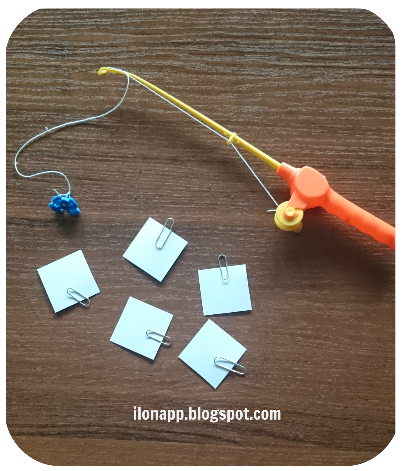 Wędkę kupiłam już z magnesem – niekiedy te z magnesami pojawiają się w małych sklepikach zabawkowych lub w sklepach typu "Wszystko po 5zł". Możemy też sami wykonać taką wędkę: patyczek/rurka z balonu, sznurek i magnes na przykład przykleić klejem na gorąco 🙂
