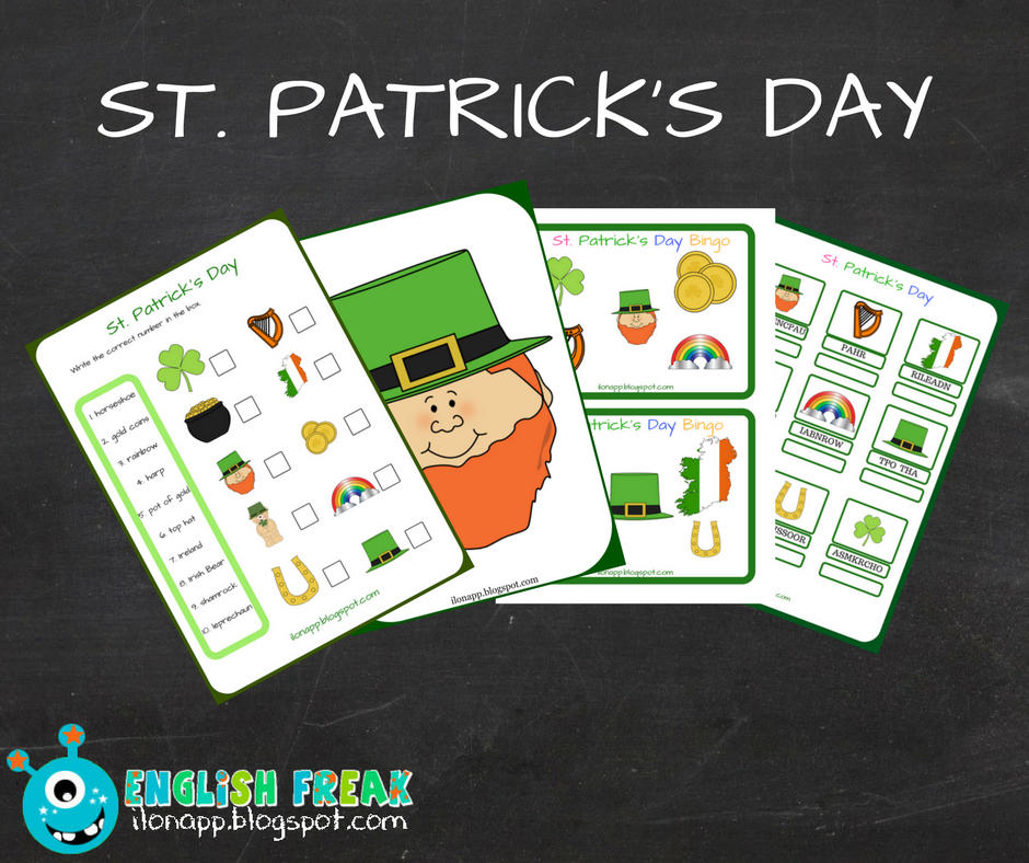 Dzień Świętego Patryka obchodzony jest 17 marca ku czci misjonarza, który wedle licznych legend był cudotwórcą (uwolnił Irlandię od plagi węży, przywracał wzrok lub życie umarłym). Przygotowałam karty obrazkowe (flashcards), grę bingo oraz dwie karty pracy (worksheets). Oprócz materiałów do druku przedstawię Wam dwa filmiki z You Tube dotyczące Dnia Św. Patryka oraz piosenkę. Podlinkuję również kilka propozycji na prace plastyczne ☺