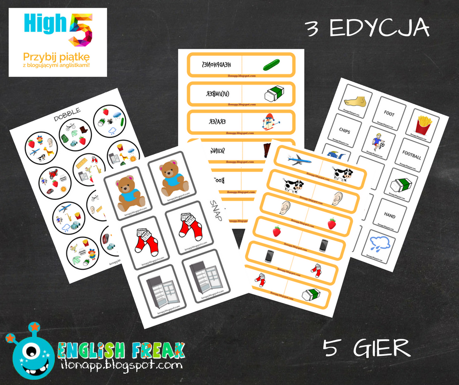 Bardzo się cieszę, iż mogłam wziąć udział w trzeciej edycji „High 5 – przybij piątkę” 🙂 Post powstawał bardzo długo, ponieważ mój czas ostatnio nie jest kontrolowany przeze mnie, a przez jedną małą osóbkę, dzięki której zarządzanie czasem ma zupełnie inny wymiar. Przejdźmy do konkretów – w akcji wzięło udział 11 blogerek. Naszym tematem przewodnim były przedwakacyjne i wakacyjne lekcje. Ja postanowiłam przygotować dla Was 5 gier powtórkowych, które możecie wykorzystać zarówno w klasie, jak i w domu czy na wakacjach / w podróży. Jak wiadomo kontakt z językiem nie powinien być przerywany na dłuższy czas…