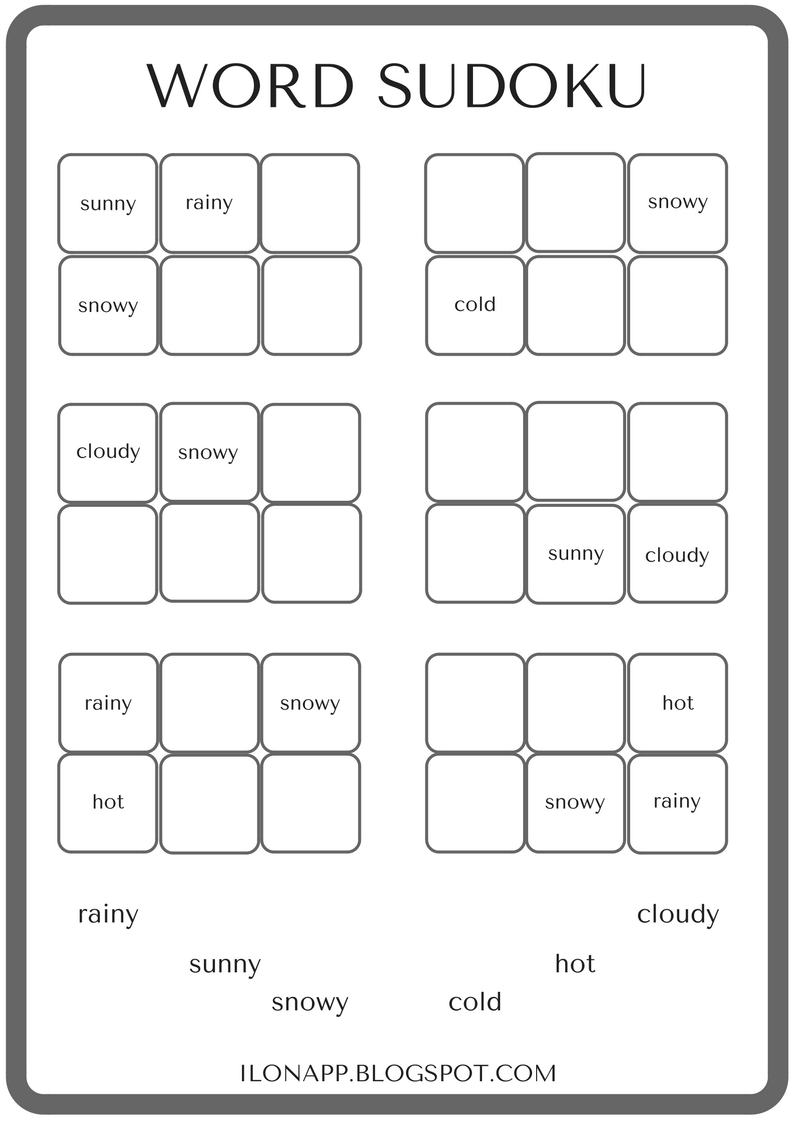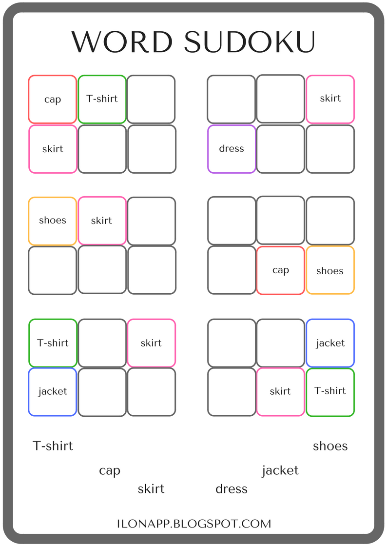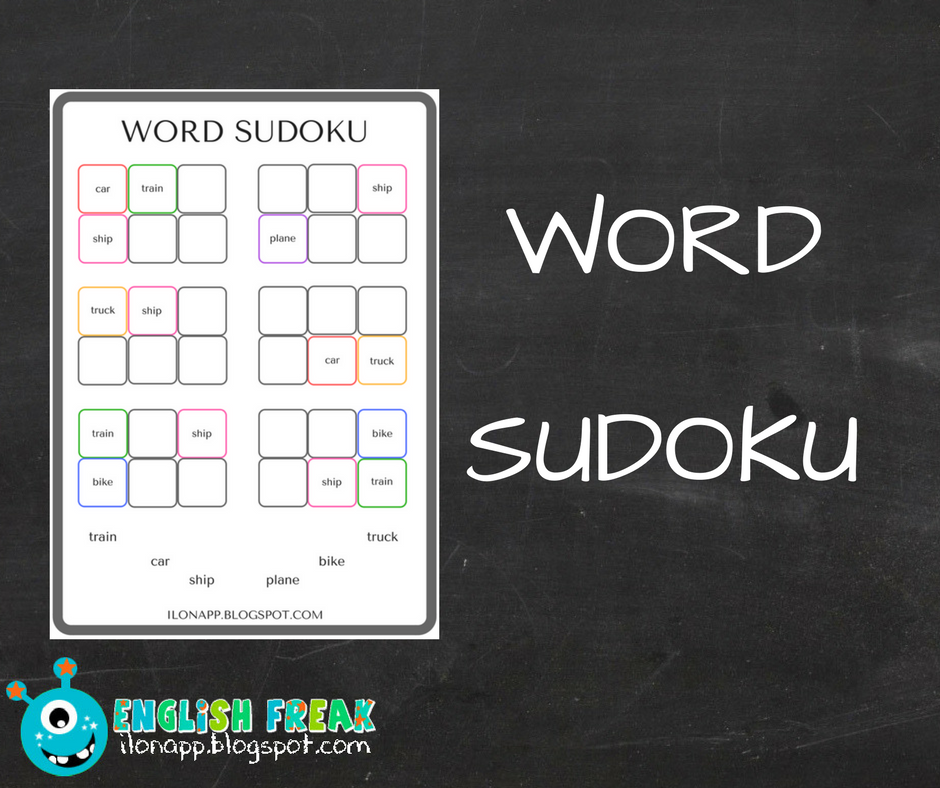 Osobiście lubię sudoku, ponieważ trzeba troszkę pogłówkować, ale jednocześnie można się zrelaksować. Być może Wasi uczniowie również polubią taką formę – zwłaszcza, że mogą zadanie przygotować dla kolegi / koleżanki lub nauczyciela / lektora. Przy okazji wpisywania wyrazów, powtarzają je i przypominają sobie ich prawidłowy zapis.