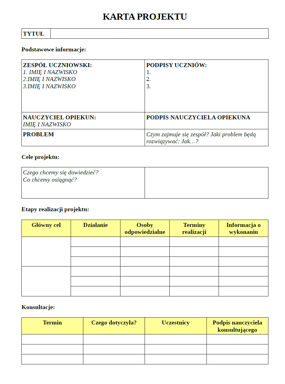- dokładny plan pracy: tytuł, cele, terminarz, formy i metody pracy, kryteria oceny, sposób przedstawienia efektów,