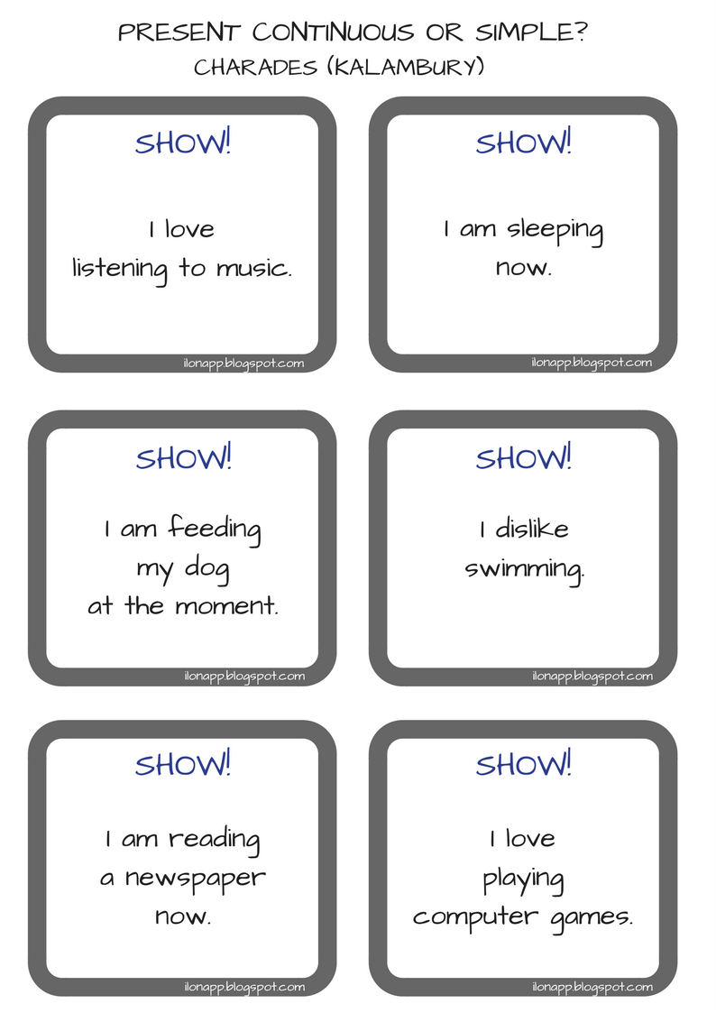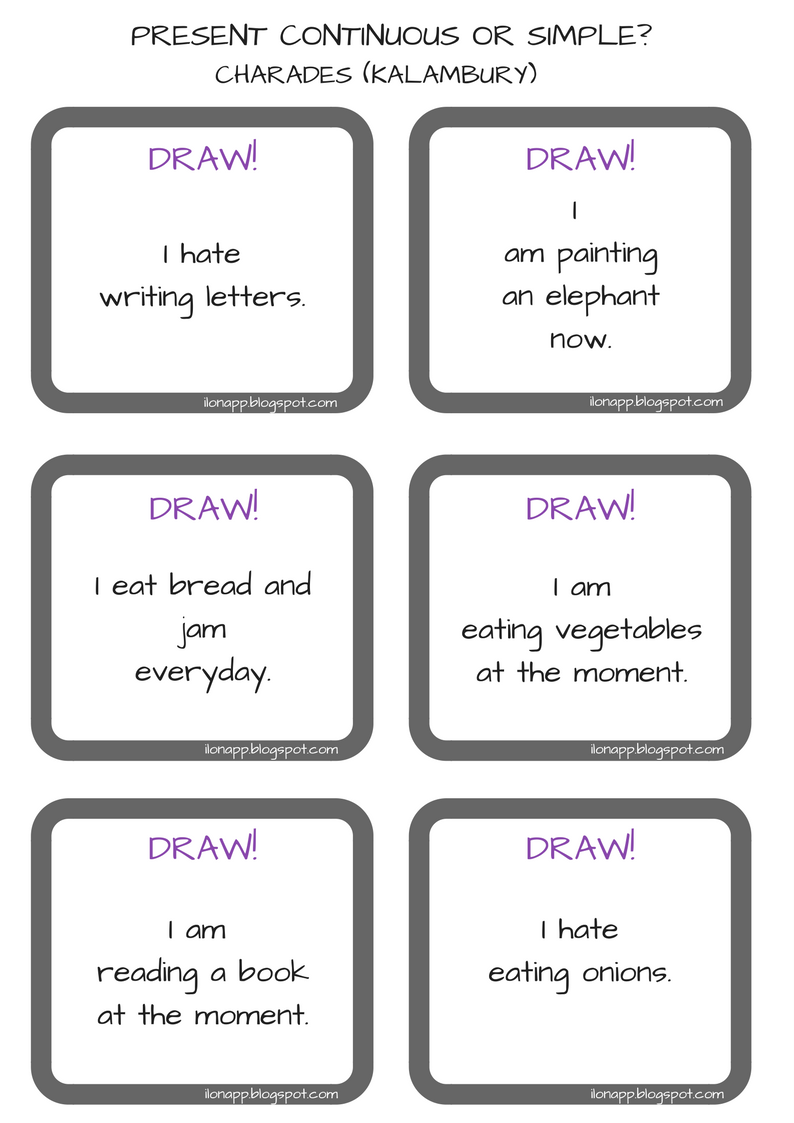 Pozostajemy w tematach gramatycznych – było już układanie zdań w Present Continuous oraz Present Simple, więc przyszedł czas na aktywność, która bardziej rozrusza Naszych uczniów / kursantów. Proponuję gramatyczne kalambury 🙂