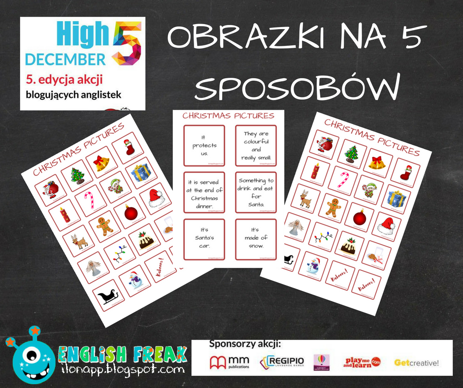 Nadeszła ta chwila, gdy piąta edycja akcji „High 5 – przybij piątkę z blogującymi anglistkami” ujrzała światło dzienne. Jak sam tytuł wskazuje: HIGH FIVE, DECEMBER! – OBRAZKI NA 5 SPOSOBÓW, będziecie mieli okazję zapoznać się z zimowymi i świątecznymi pomysłami. W tej edycji bierze udział 13 blogów, więc polecam zaparzenie herbatki czy kawki, gdyż przed Wami AŻ 65 pomysłów!