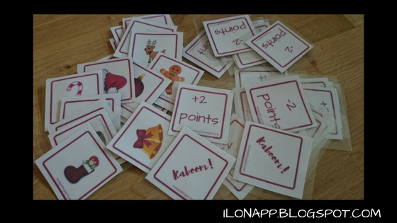Uczniowie wybierają jedną karteczkę i nazywają, co jest na obrazku i otrzymują go jako punkt. Gdy w ich rękach ukaże się słowo „Kaboom”, stosujemy się do uprzednio ustalonych reguł: oddajemy wszystkie obrazki lub jeden do wspólnej puli / osobie po lewej itp. Przygotowałam również dodatkowe karty funkcyjne, które dodają lub odejmują punkty. Wygrywa osoba z największą ilością obrazków.