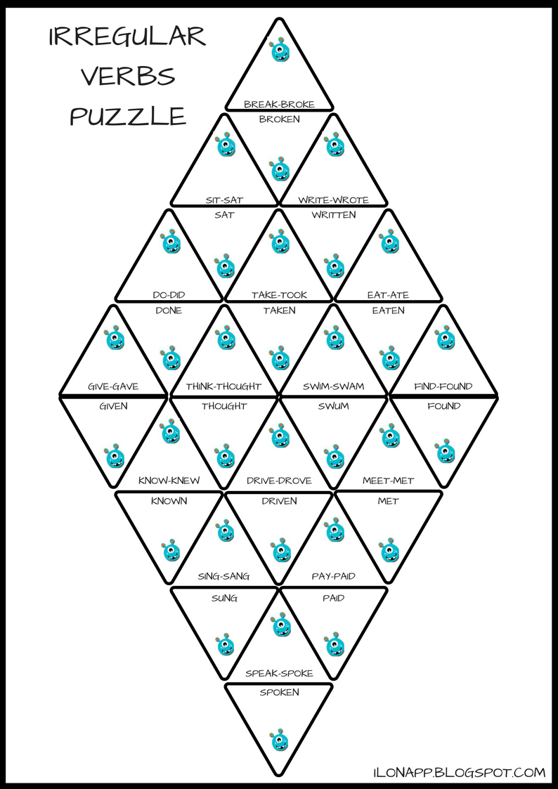 Moja pierwsza myśl to czasowniki nieregularne 🙂 Drukujemy przygotowaną przeze mnie planszę lub dajemy uczniom pustą i pozwalamy na stworzenie własnej układanki poprzez wybór poszczególnych czasowników. Rozcinamy, mieszamy i działamy!