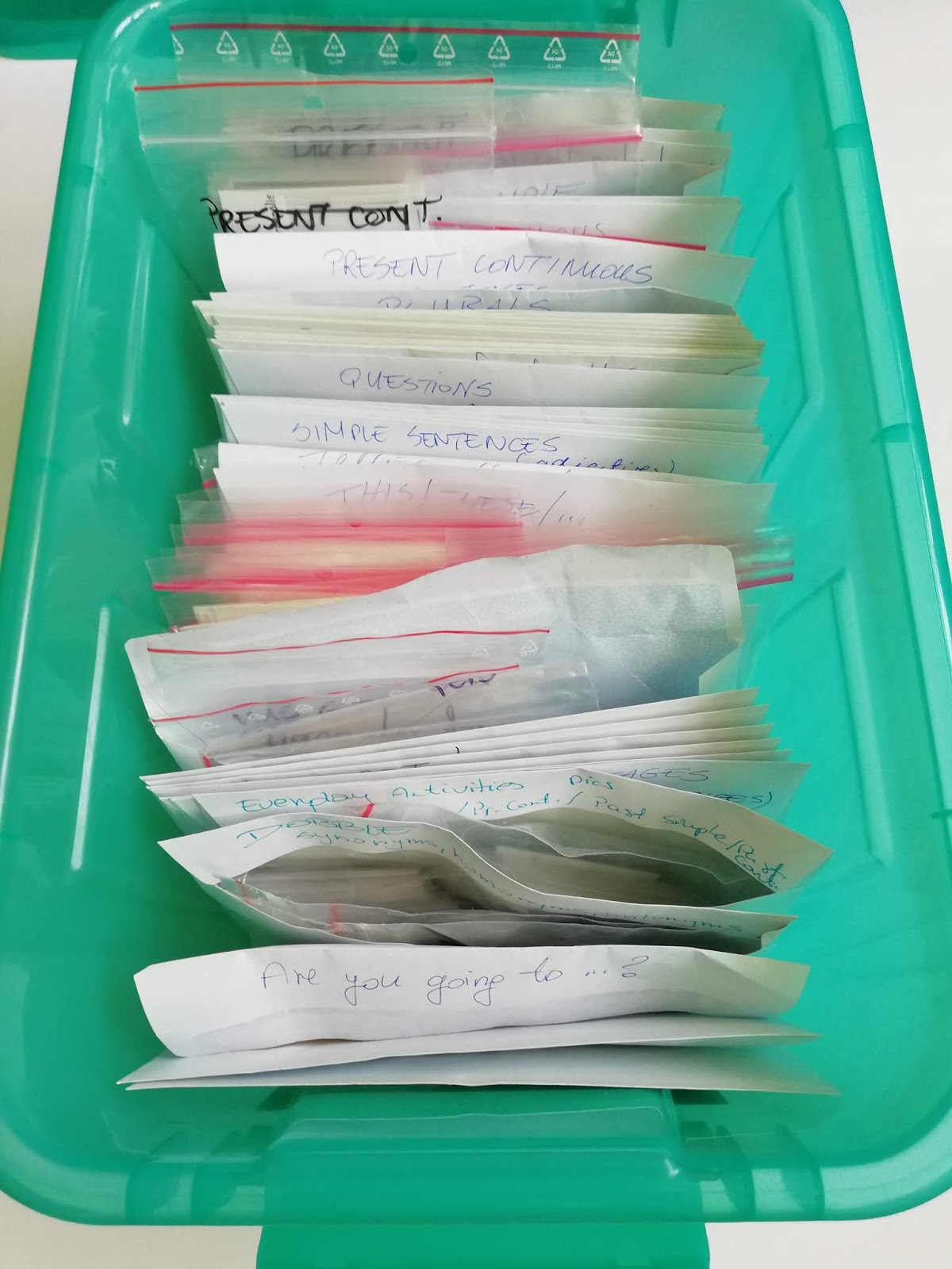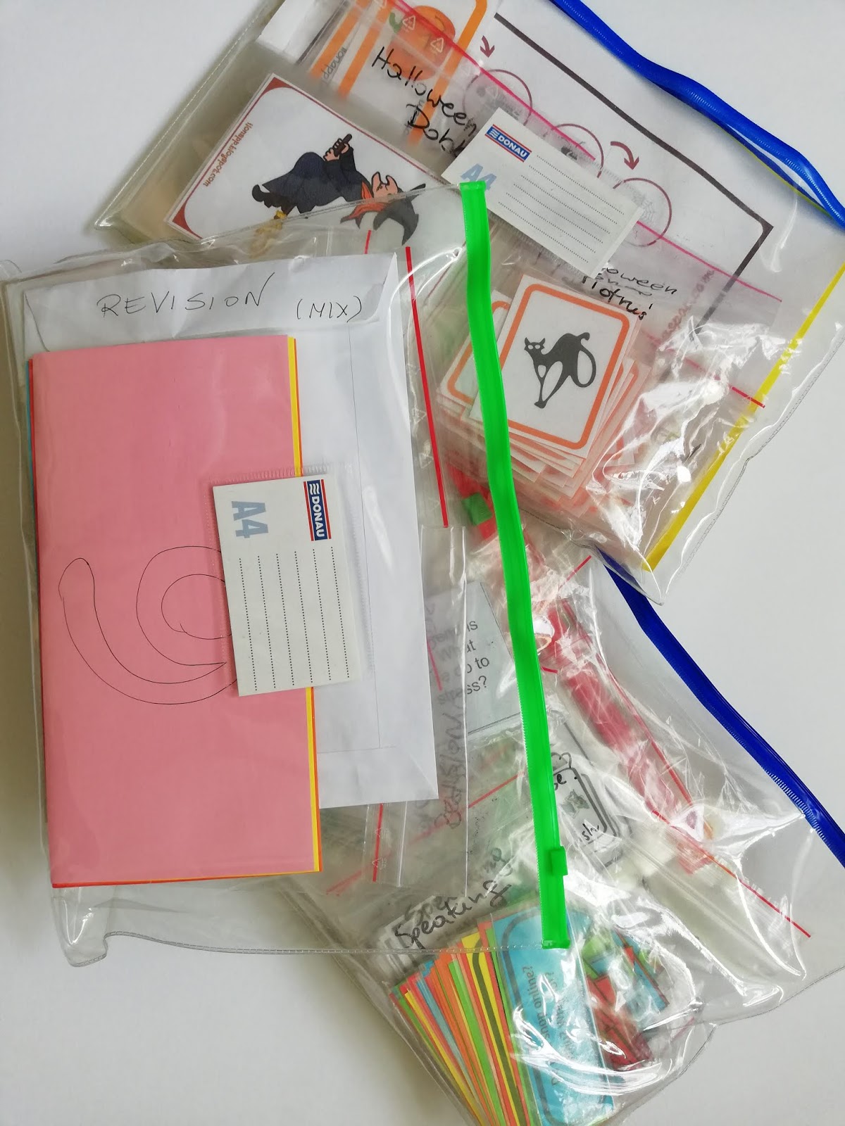 • Kolejną istotną kwestią jest segregacja pomocy dydaktycznych. U mnie sprawdza się system: gramatyka, speaking (mówienie), powtórki (revision), karty obrazkowe oraz gry wszelakie. Do porządkowania stosuję koperty oraz prześwitujące teczki / worki zip.