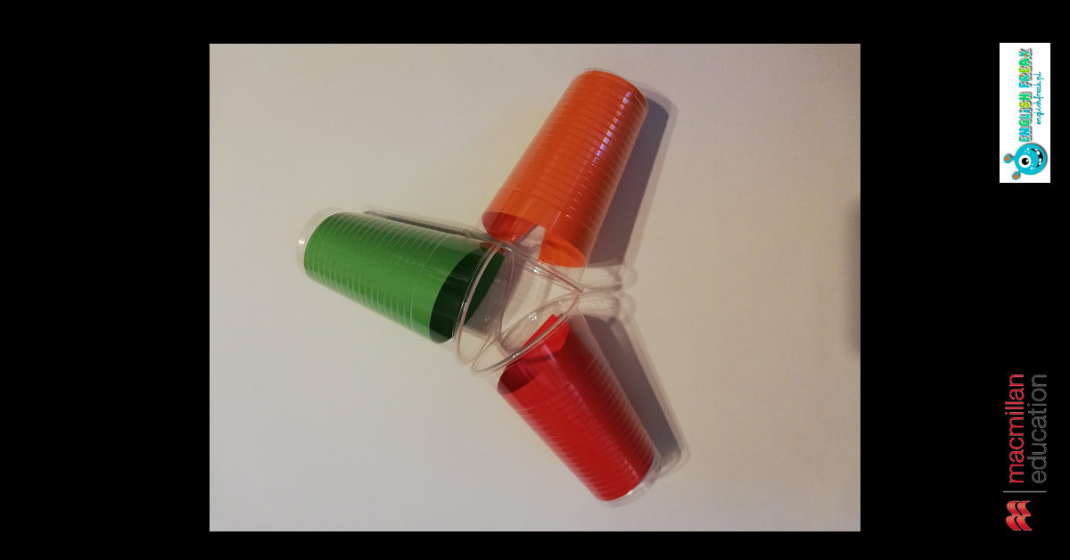 Kubeczki na zajęciach możemy wykorzystać jako pionki. Rozkładamy Flashcard z wybranego unitu na podłodze i tworzymy gigantyczną plansze, w której polami są kary a pionkami kubki. Dzieci rzucają kostką i przesuwają kubki po planszy, nazywając to co znajduje się na karcie.