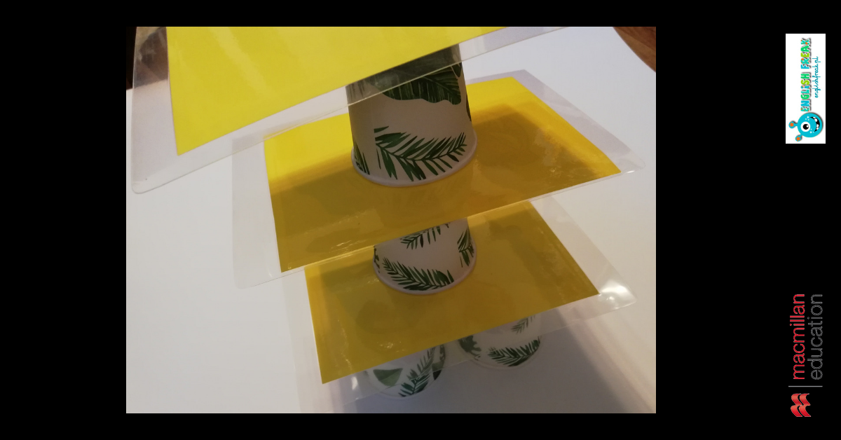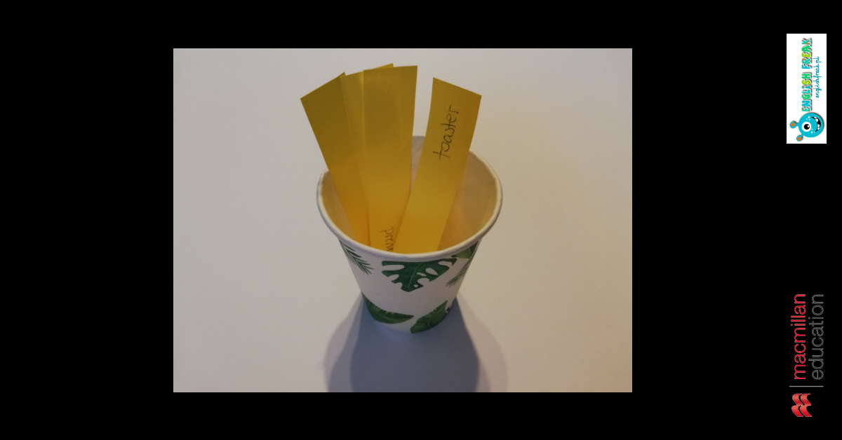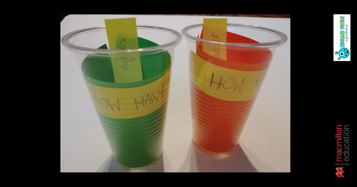 Innymi słowy jest to wersja maxi. Dlatego też uczniowie będą potrzebowali większej planszy (takiej aby zmieściło się na niej 9 kubeczków) oraz dwóch kolorów / wzorów kubków. Aby postawić kubek na danym polu należy podać tłumaczenie wyrazu lub ułożyć z nim zdanie. Na kartkach mogą również znaleźć się pytania, ma które będą odpowiadać 🙂