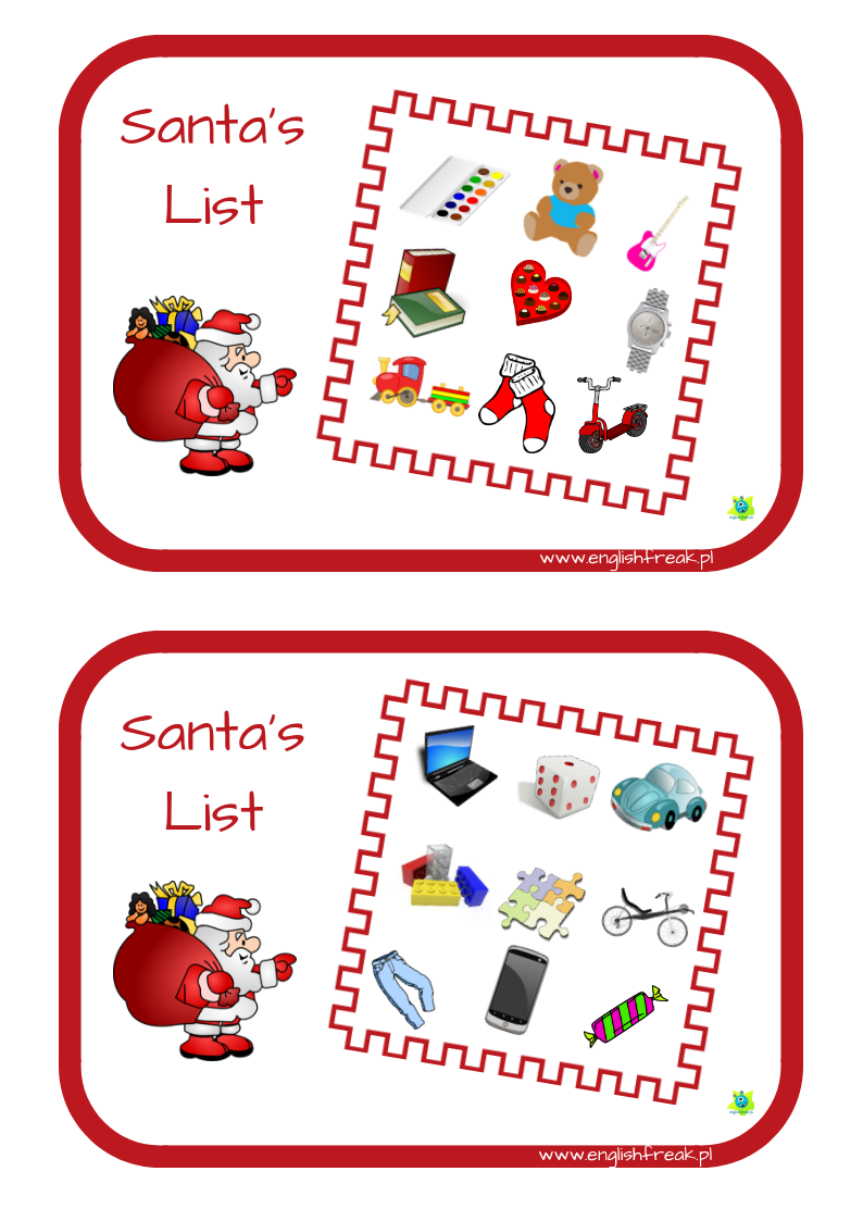 Skoro dotrwaliście do tego momentu to czas na nową grę bingo w wersji świątecznej. Powtórzymy dzięki niej przedmioty i zwierzątka, które kojarzone są z prezentami. Grę nazwałam „Santa’s List”. Składa się ona z 12 plansz oraz karteczek obrazkowych niezbędnych dla prowadzącego rozgrywkę bingo.