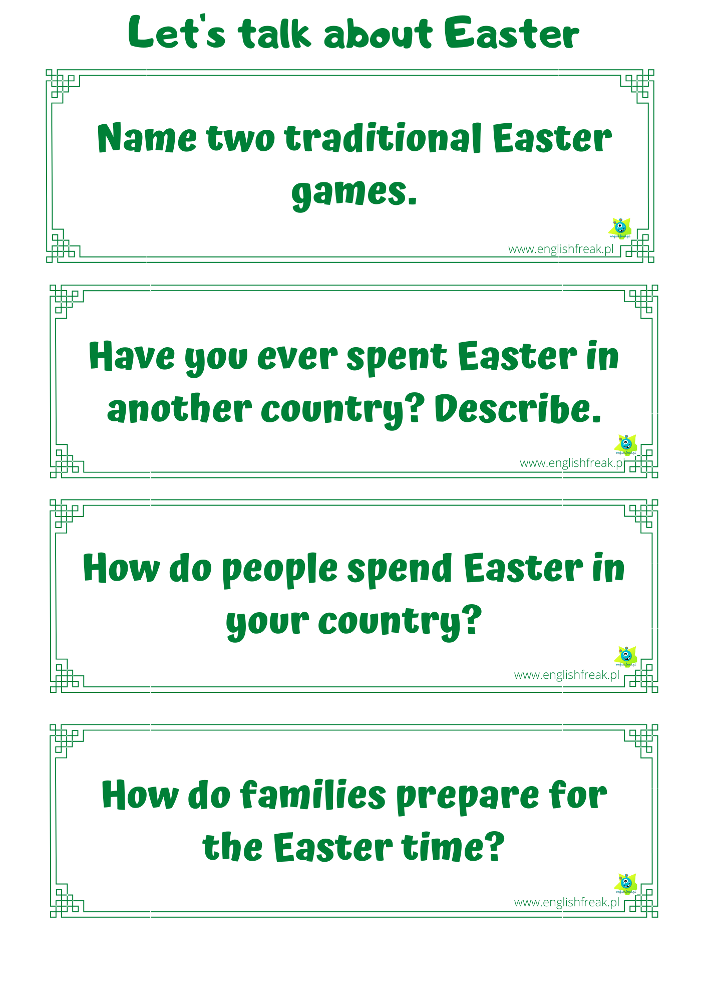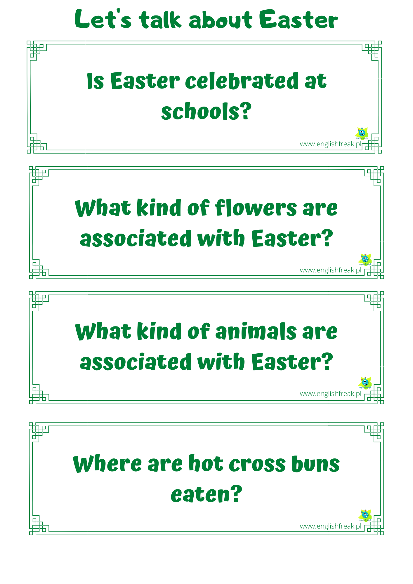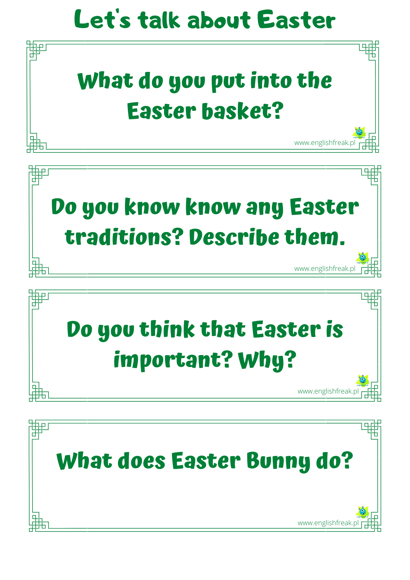 Świątecznych materiałów jest już całkiem sporo na blogu, ale patrząc na obecną sytuację stworzyłam jeszcze karty konwersacyjne. Mogą one być wykorzystane na zajęciach offline oraz online. Zestaw składa się z 20 pytań dotyczących Wielkanocy, tradycji i symboli.