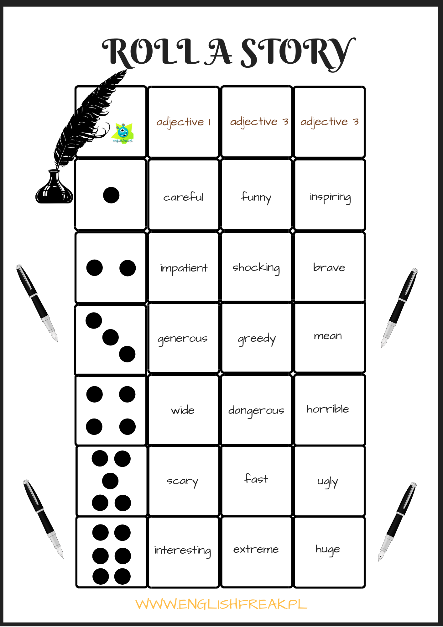 Turlane historyjki polegają na wylosowaniu trzech podpowiedzi, które stają się bazą do stworzenia opowiadania. Do tej pory na kartach widniały podpowiedzi dotyczące oosby, miejsca oraz problemu. Tym razem na planszach umieściłam przymiotniki oraz czasowniki, więc zadanie jest troszkę utrudnione.