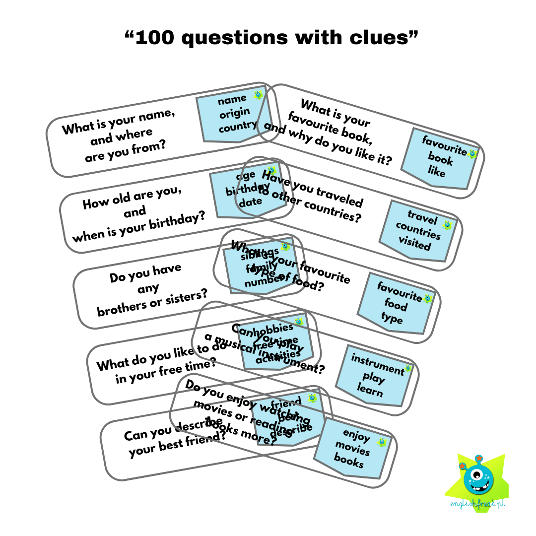 Czy szukasz sposobu na przełamanie bariery językowej i zachęcenie uczniów do budowania dłuższych wypowiedzi? „100 questions with clues” to potężny zestaw kart konwersacyjnych, który został stworzony, aby raz na zawsze wyeliminować krótkie, jednowyrazowe odpowiedzi.