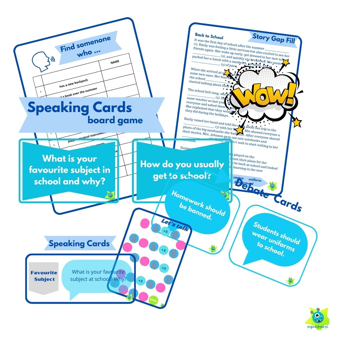 „Back To School Pack” to duży zestaw materiałów przydatnych w pierwszych tygodniach nauki. Karty konwersacyjne, gra.