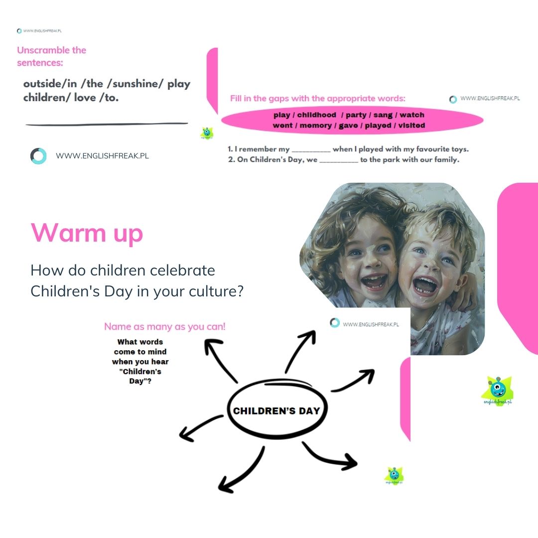 Szukasz gotowego pomysłu na radosną, a zarazem wartościową lekcję z okazji Dnia Dziecka? „Children’s Day – prezentacja A2” to materiał w formie estetycznej prezentacji PDF, który idealnie sprawdzi się na zajęciach stacjonarnych oraz online.