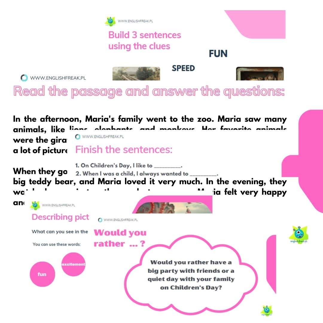 Children’s Day – prezentacja A2 (PDF) Świętuj Dzień Dziecka, rozwijając językowe skrzydła swoich uczniów! Children’s Day – prezentacja A2 to kompletny zestaw zadań – od czytania ze zrozumieniem po zabawne pytania „Would you rather”. Ponieważ materiał łączy rzetelną gramatykę z atrakcyjnymi wizualnie opisami obrazków, Twoi uczniowie nawet nie zauważą, jak dużo się nauczyli. Materiał wysyłany natychmiast, gotowy do wyświetlenia na dowolnych zajęciach!