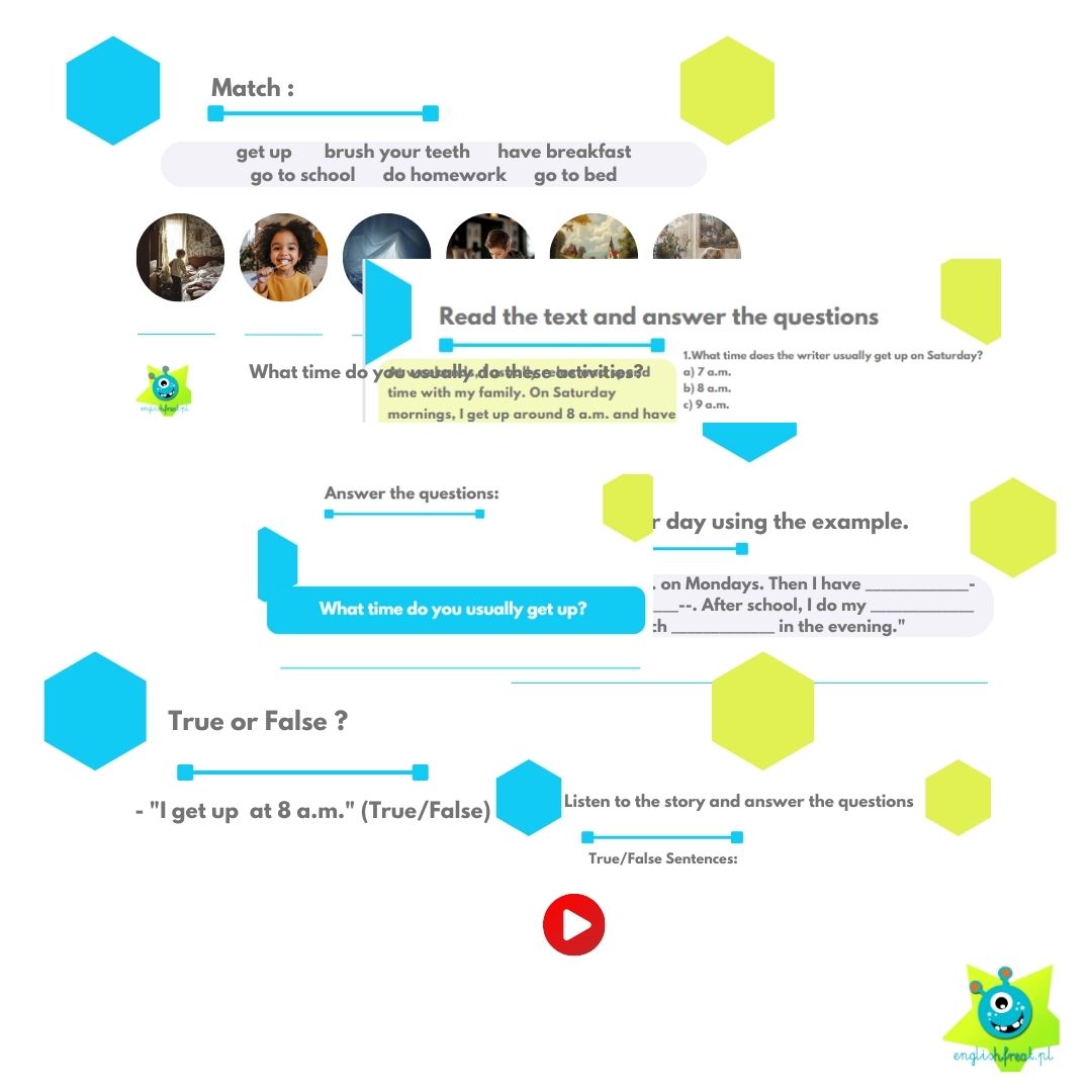 Daily Routines – Multimedialny zestaw do nauki planu dnia (PDF) Przenieś swoje lekcje na wyższy poziom! Daily Routines to profesjonalna prezentacja PDF łącząca naukę słownictwa z intensywnym treningiem czytania, słuchania i mówienia. Ponieważ materiał zawiera kompletny zestaw zadań – od rozgrzewki po zadanie domowe – otrzymujesz „gotowca”, który zaktywizuje każdego ucznia na poziomie A2+. Materiał wysyłany natychmiast, gotowy do wyświetlenia na dowolnym urządzeniu!
