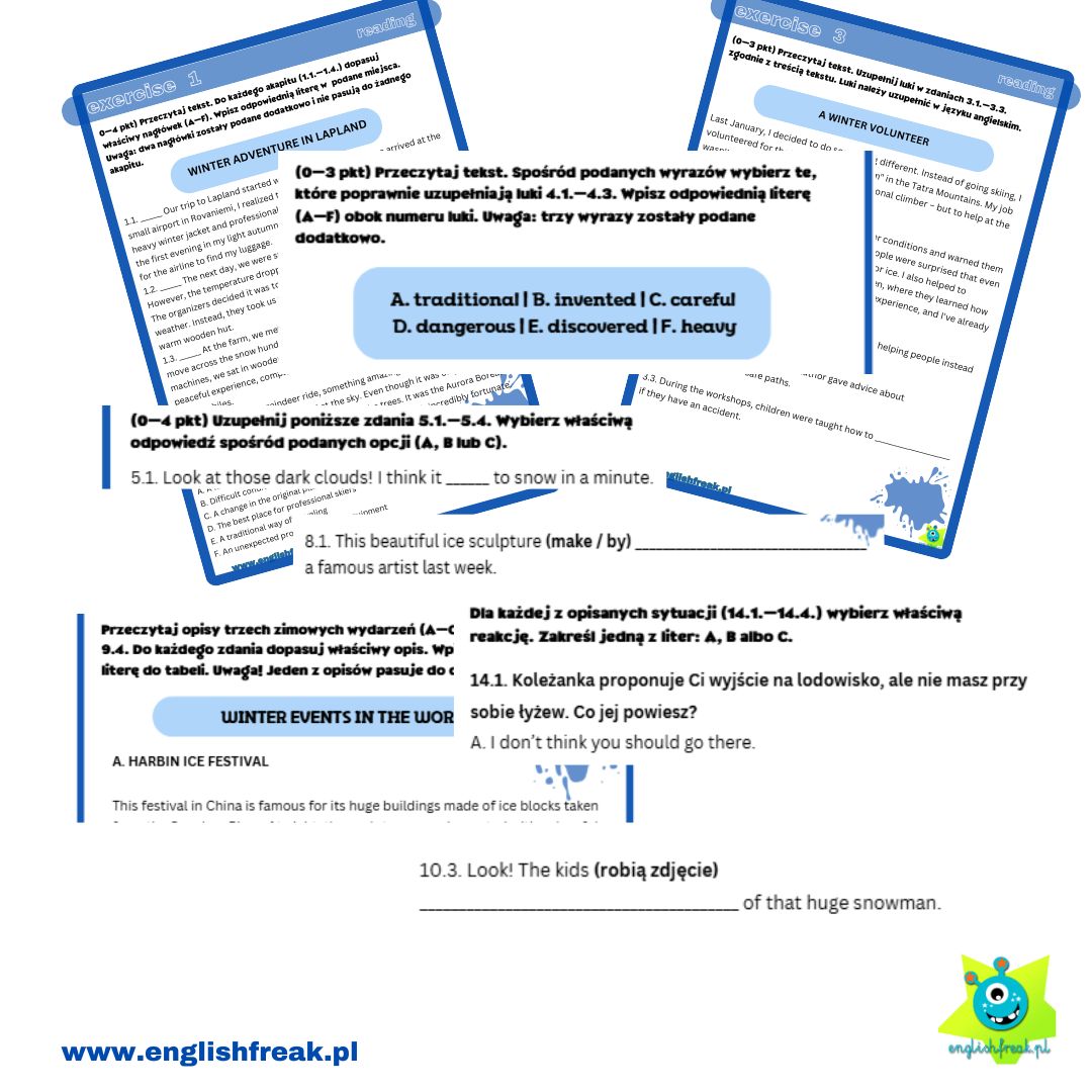 Dzięki temu materiałowi Twoi uczniowie oswoją się ze strukturą prawdziwego egzaminu, jednocześnie utrwalając słownictwo związane z feriami, sportami zimowymi i pogodą. To idealne narzędzie na powtórki po przerwie świątecznej!
