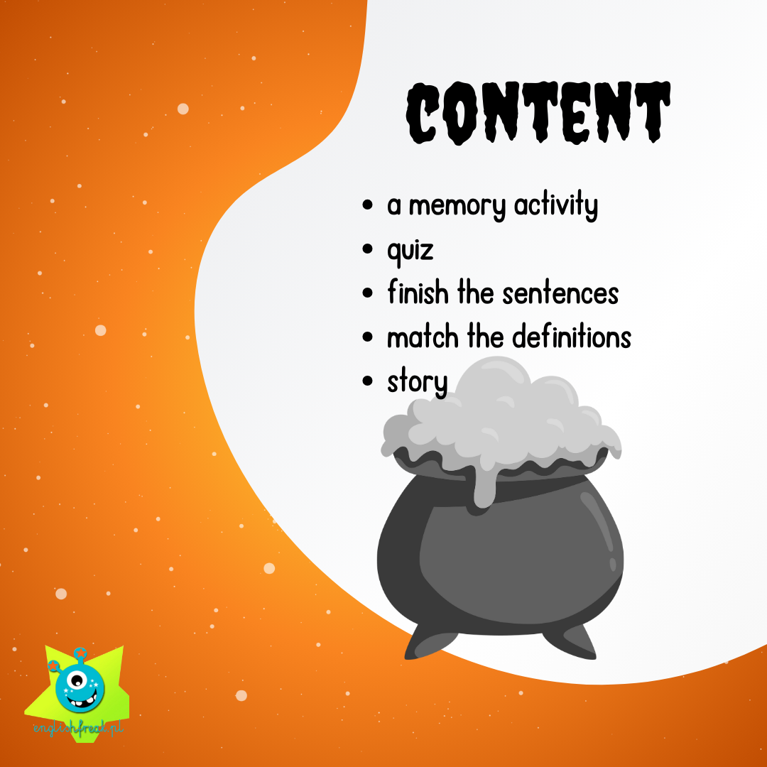Dzięki temu zestawowi Twoi uczniowie na poziomie A2/A2+ nie tylko poczują klimat święta, ale przede wszystkim opanują szeroki zakres słownictwa tematycznego. Prezentacja pozwala na utrwalenie takich słów jak: tomb, scarecrow, witch, vampire, broomstick, haunted house, skull, skeleton, pumpkin, werewolf, mummy, jack-o’-lantern, coffin, spiderweb, ghost oraz spider.