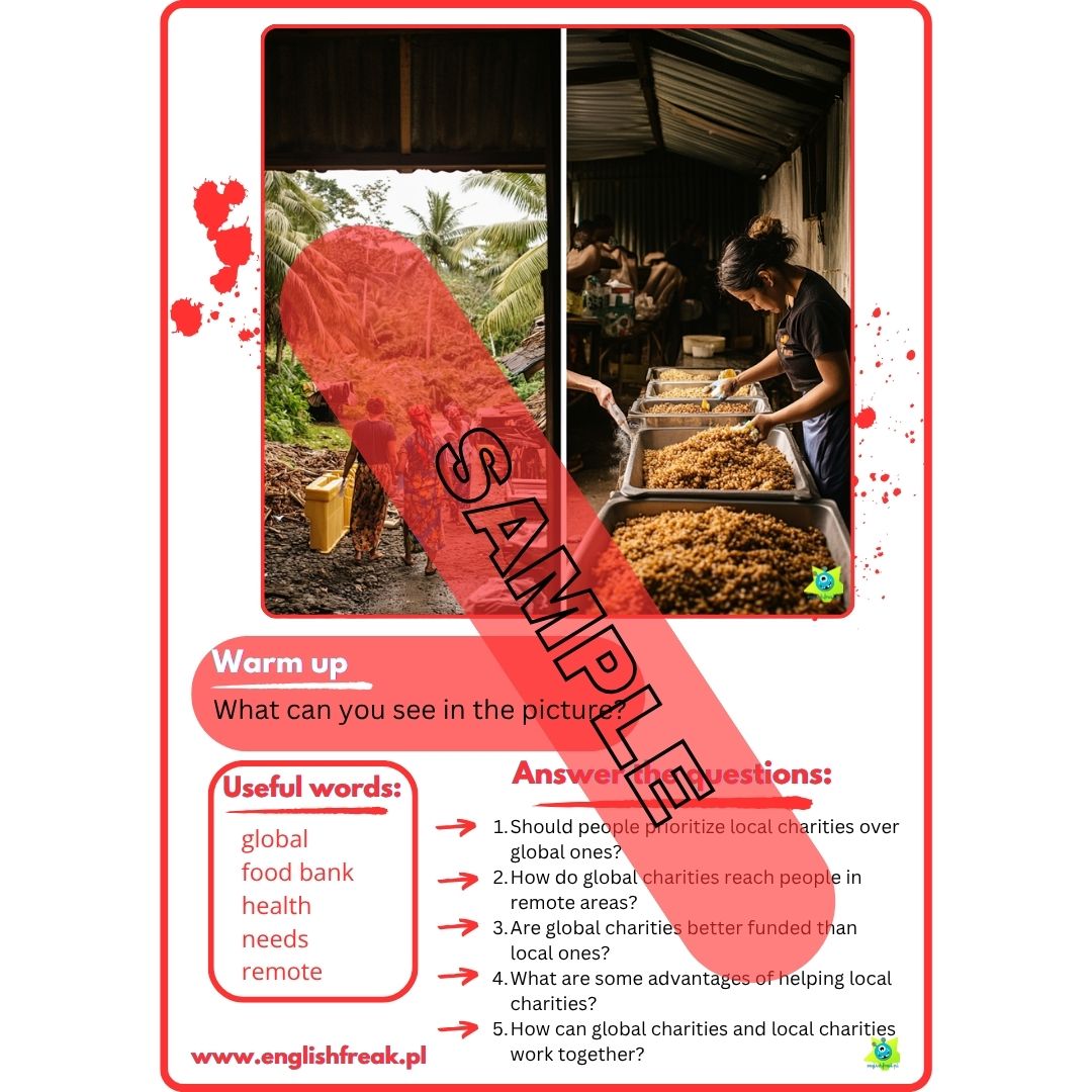 „Let’s talk about helping and charity” to zestaw 12 kart konwersacyjnych PDF. Wspierają one uczniów w budowaniu wypowiedzi ustnych oraz rozwijaniu słownictwa z zakresu pomagania i działalności charytatywnej.