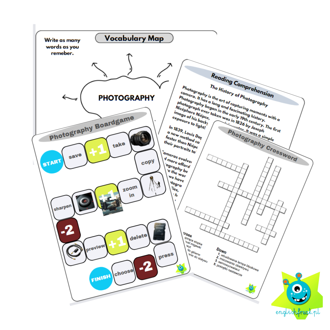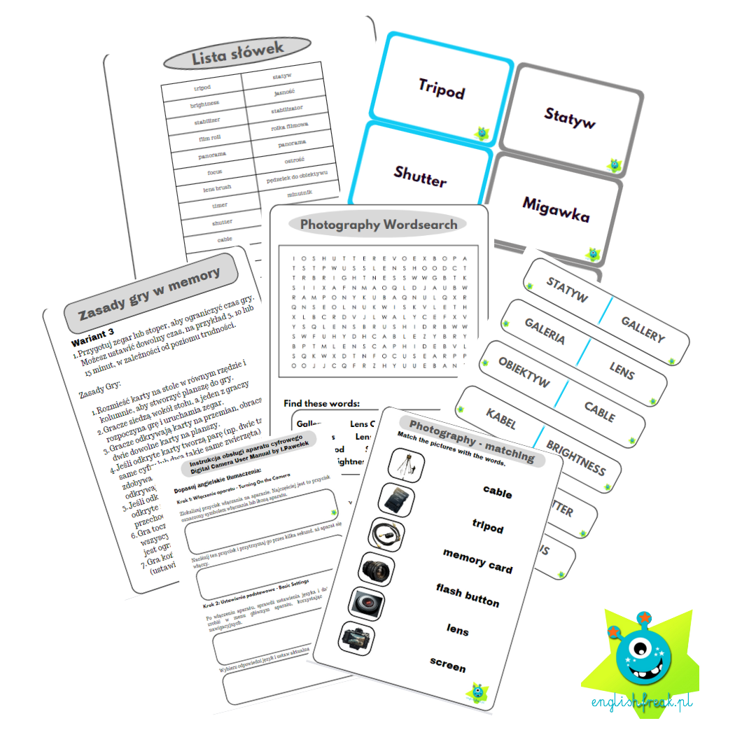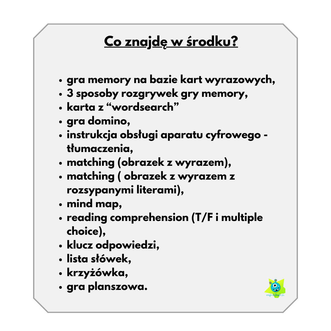 Zestaw pozwoli na zorganizowanie kilku zajęć w ramach języka angielskiego zawodowego. Jego elementy można wykorzystać podczas rozgrzewki językowej, utrwalania i powtarzania materiału.