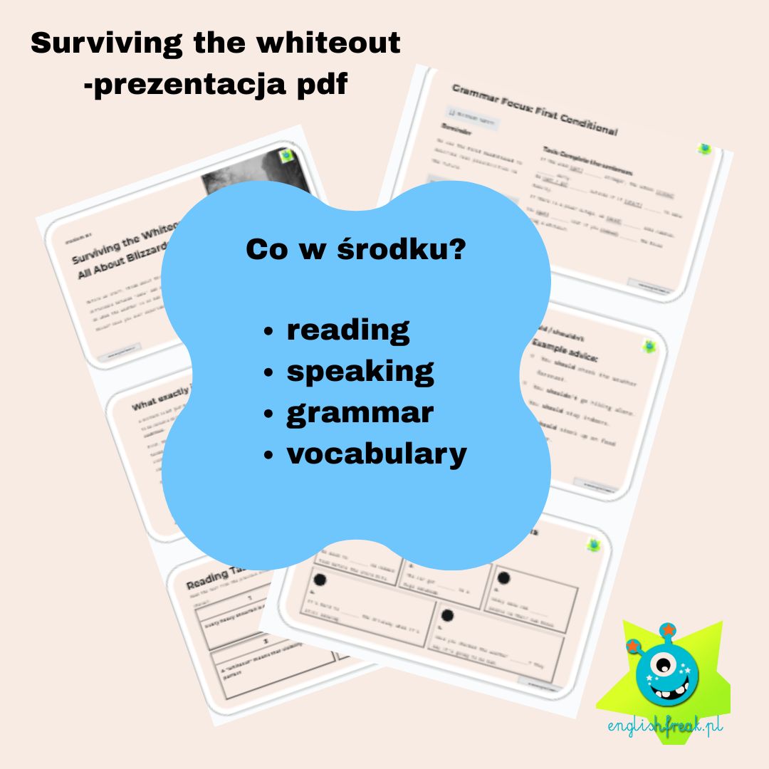 Angielski B1: Materiały o śnieżycach. Prezentacja PDF „Surviving the Whiteout”. Gotowe zadania na speaking, reading i gramatykę. Idealne dla nauczycieli i lektorów w Polsce!