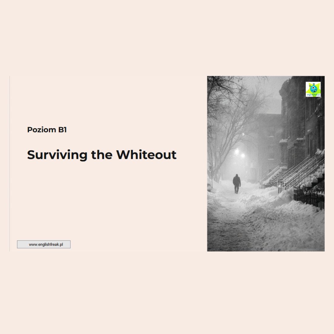 Szukasz gotowego pomysłu na angażującą lekcję języka angielskiego? Prezentacja „Surviving the Whiteout” to kompleksowy materiał dydaktyczny w formacie PDF, który został stworzony specjalnie z myślą o uczniach na poziomie B1 (Intermediate). Ponieważ tematyka ekstremalnych zjawisk pogodowych i śnieżyc zawsze budzi emocje, jest to doskonały sposób na przełamanie rutyny oraz wprowadzenie słownictwa, które realnie interesuje zarówno młodzież, jak i dorosłych.