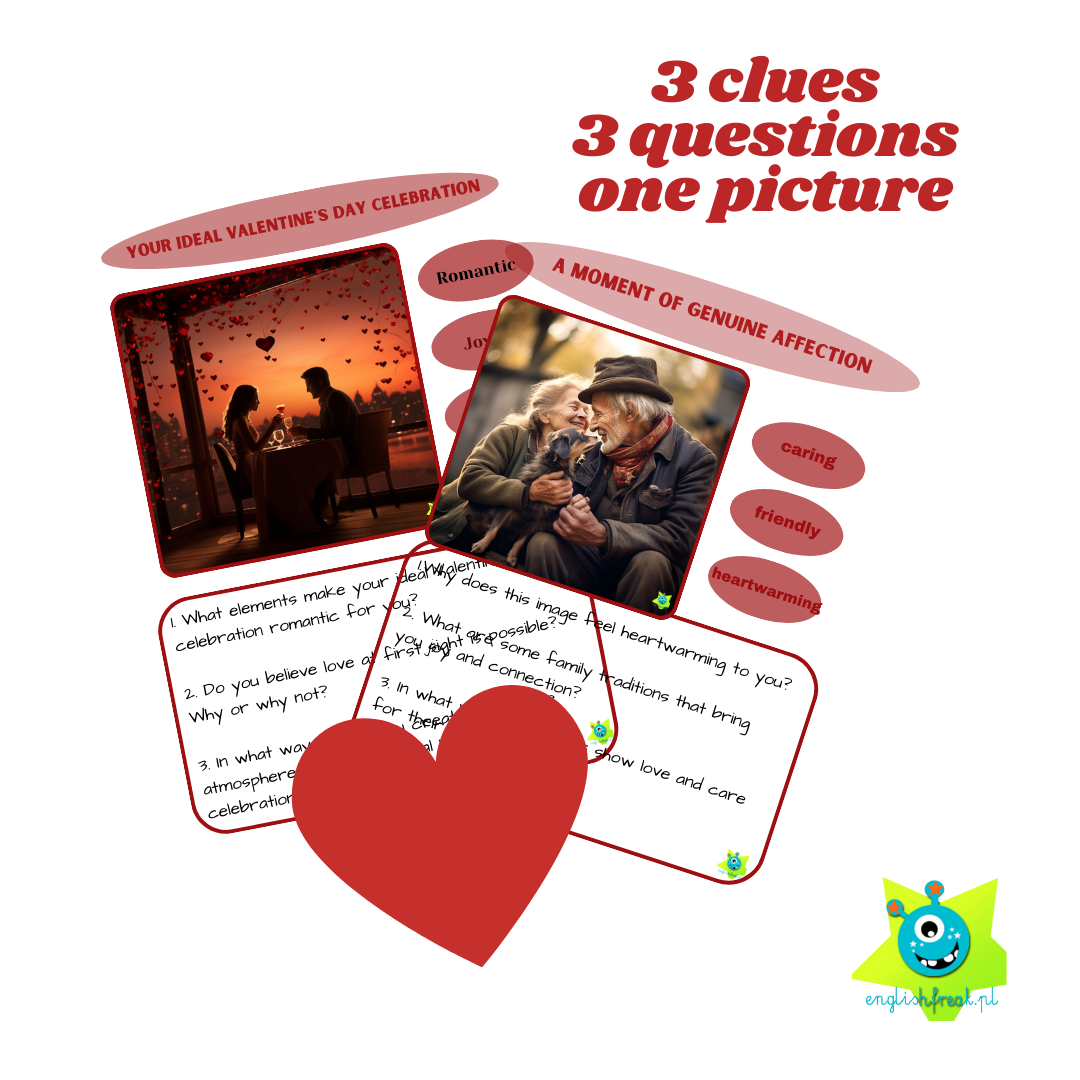 Valentine’s Day Speaking Sets – Rozgadaj swoich uczniów! (PDF) Postaw na komunikację i emocje! Valentine’s Day Speaking Sets to zestaw 15 profesjonalnych kart konwersacyjnych łączących opis obrazka ze wsparciem słownikowym i pytaniami o relacje. Ponieważ materiał skupia się na tematach bliskich każdemu (przyjaźń, miłość, troska), idealnie nadaje się na rozgrzewki oraz pełne lekcje konwersacyjne na poziomie A2-B1+. Materiał w formacie PDF – gotowy do natychmiastowego wykorzystania!